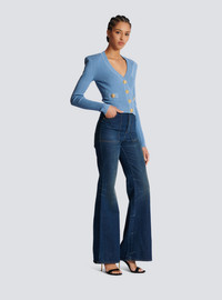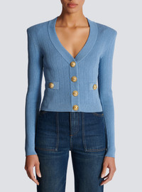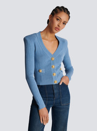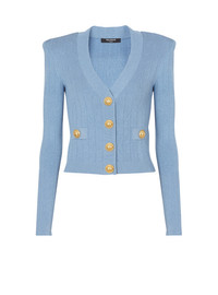 Fine ribbed knit buttoned cardigan - Tight fit - V-neck - Structured shoulders, long sleeves - Fastening with 4 “Signature Coin” golden metal buttons on the front - 2 trompe-l'œil pockets - Model measures 180cm and wears a size 36 - Main material: 83% viscose 17% polyester - Made in France - Item: CF1KL007KB07100% of the viscose fibres used to make this garment come from responsibly managed and FSC®-certified forests