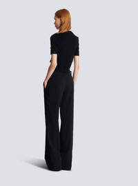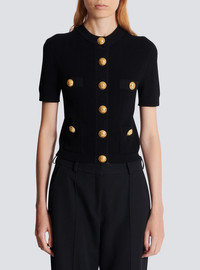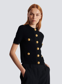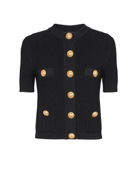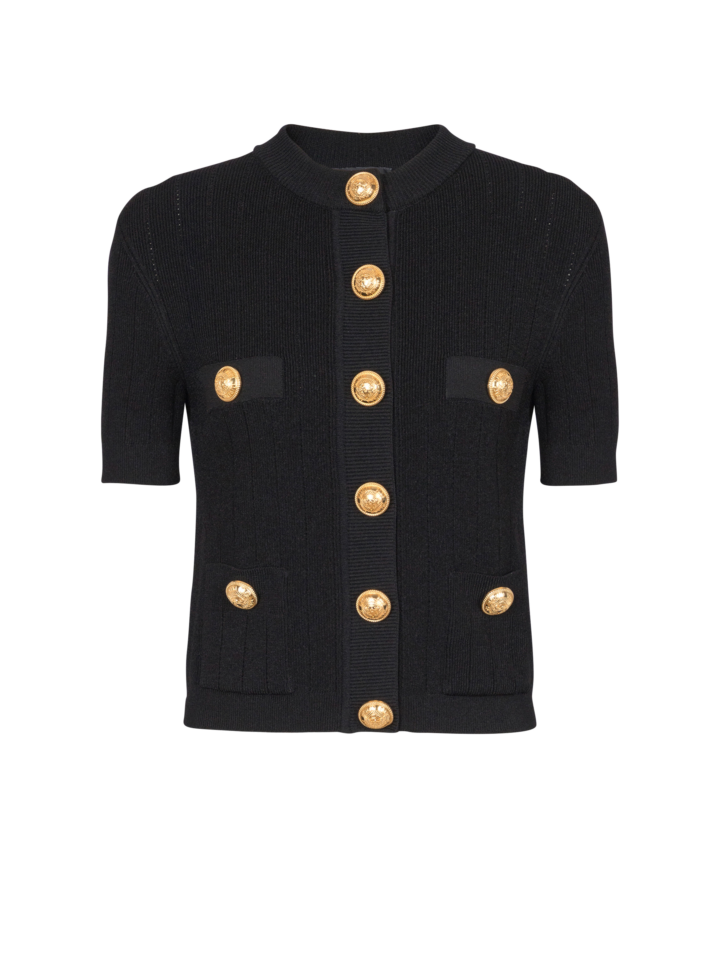 Fine ribbed knit cardigan with buttons - Fitted cut - V-neck - Structured shoulders, short sleeves - Front fastening with 4 "Signature Coin" gold metal buttons - 2 fake pockets - Model measures 179cm and wears a size 36 - Main material: 83% viscose 17% polyester - Made in France - Item: EF1KL023KB07100% of the viscose fibres used to make this garment come from certified, sustainably managed forests