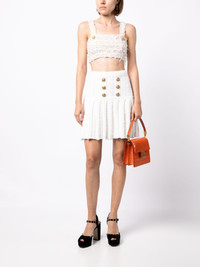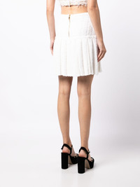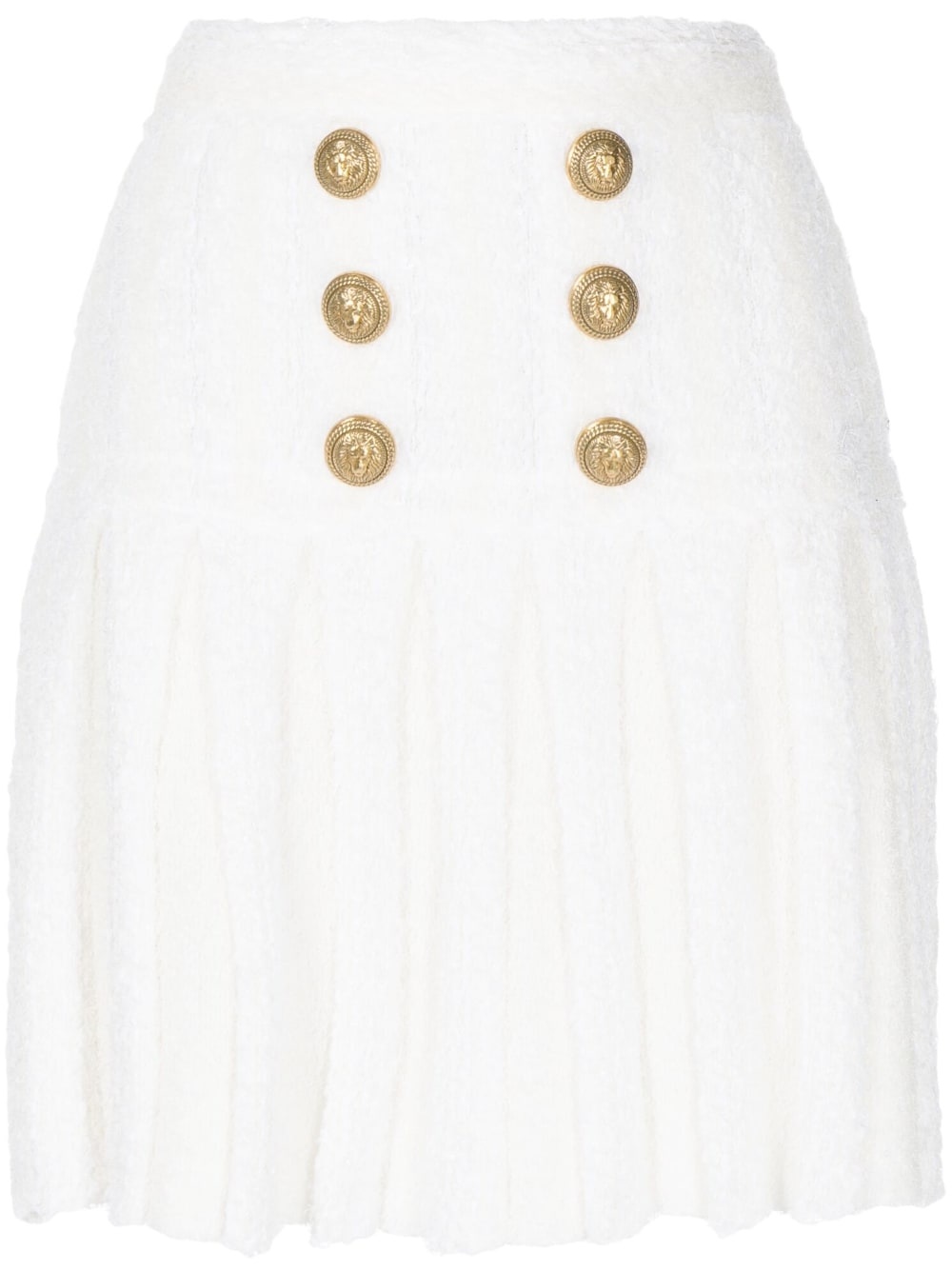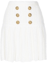 buttoned pleated mini skirt Strong silhouettes adorned with maximalist detailing are Balmain's forte, as evidenced by this white textured mini skirt. It's elevated by hallmark gold-tone logo-engraved buttons, nodding to the house's iconic codes. Highlights - White - Hemp blend - Textured finish - Embossed gold-tone buttons - High waist - Pleat detailing - Rear zip fastening - Thigh-length Made in France Composition Outer: Hemp 32%, Viscose 30%, Polyamide 18%, Cotton 9% SIZE & FIT Model measurements Height 5 ft 9 in(1.76 m) Bust/Chest 29.1 in(74 cm) Hips 33.1 in(84 cm) Waist 22.8 in(58 cm) FittingInformation This midi-length skirt is intended to be worn just below the waist Made from a midweight non-stretch fabric, this piece offers minimal elasticity when worn This piece fits close in all sizes – take your usual size