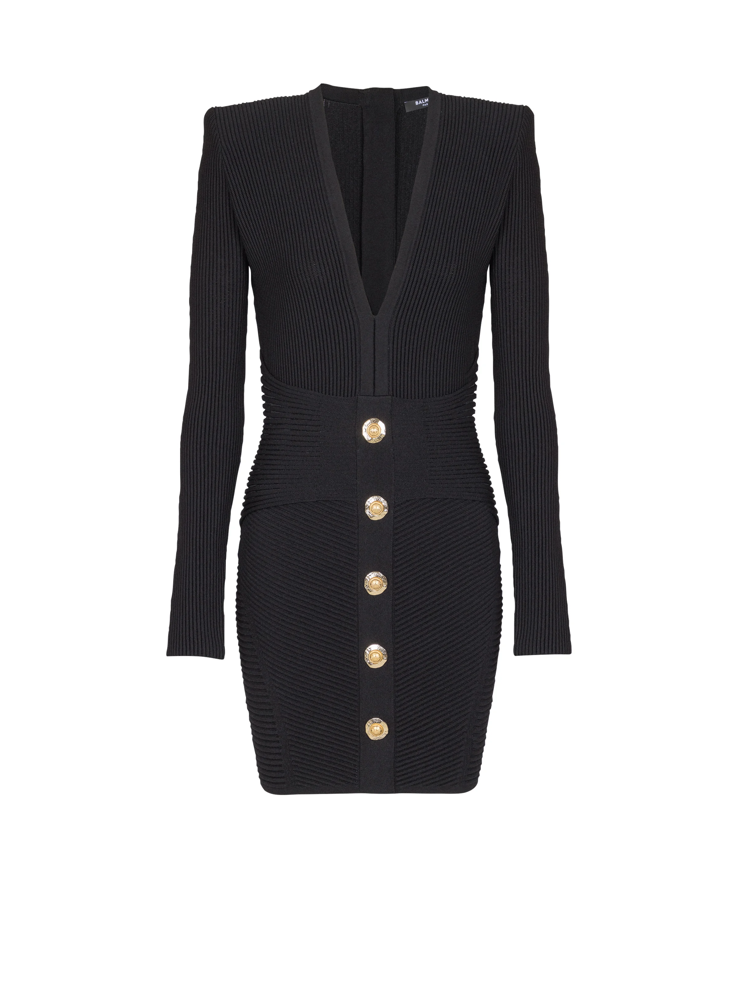 Ribbed knit bodycon dress - V-shaped neckline - Structured shoulders - Long sleeves - Rolled knit insert at the waist - 5 metal ‘Gold and Gold Coin’ decorative buttons on the front - Visible gold metal zip fastening on the back with Balmain Paris-engraved slider - Ribbed neckline and hem - Cropped slim fit - Model measures 178cm and wears a size 36 - Main material: 84% viscose 15% polyester 1% polyamide - Made in Italy - Item: FF1R9327KI51100% of the viscose fibres used to make this garment come from certified, sustainably managed forests