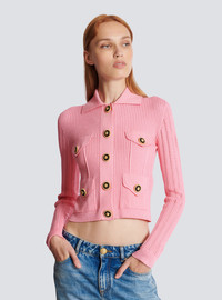 Ribbed openwork knit cardigan - Shirt collar - Long openwork knit sleeves - Fastening with 5 press studs - 2 chest pockets with fake flaps - 2 patch pockets with press-stud flaps - "Chain Lion Thread" buttons in two-tone metal - Openwork Balmain Signature logo on the back - Ribbed trim - Cropped slim fit - Model measures 181cm and wears a size 36 - Main material: 84% viscose 16% polyester - Made in Italy - Item: EF1KL150KI10100% of the viscose fibres used to make this garment come from certified, sustainably managed forests