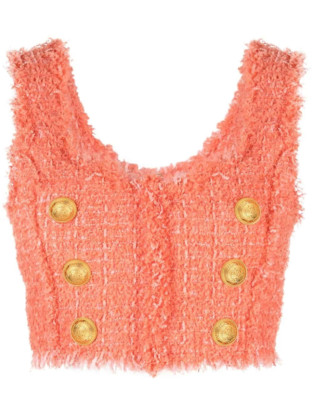 buttoned tweed cropped top Signature Balmain details — in the form of six gold-tone Coin buttons — steal focus on this top. It's woven from tweed to a cropped silhouette with a scoop neck and a zip to the rear. Highlights - Peach orange - Tweed - Embossed gold-tone buttons - Frayed detailing - Scoop neck - Rear zip fastening - Wide shoulder straps - Cropped - Straight hem Imported Composition Polyamide 79%, Virgin Wool 15%, Cotton 6% SIZE & FIT Model measurements Height 5 ft 10 in(1.78 m) Bust/Chest 31.49 in(80 cm) Hips 35.03 in(89 cm) Waist 23.62 in(60 cm) Washing instructions Dry Clean Only