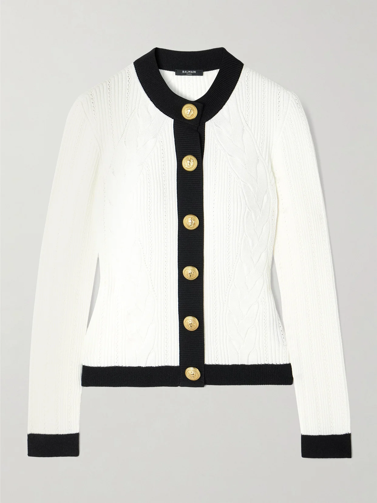 Balmain re-imagines the classically preppy cardigan through a Parisian lens, infusing it with sharp lines and the iconic gold-tone buttons. It's designed with ribbed, cable and pointelle-knit stitches that add texture and subtle dimension. Wear yours as a set with the matching mini skirt.