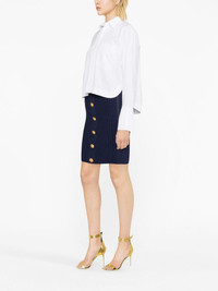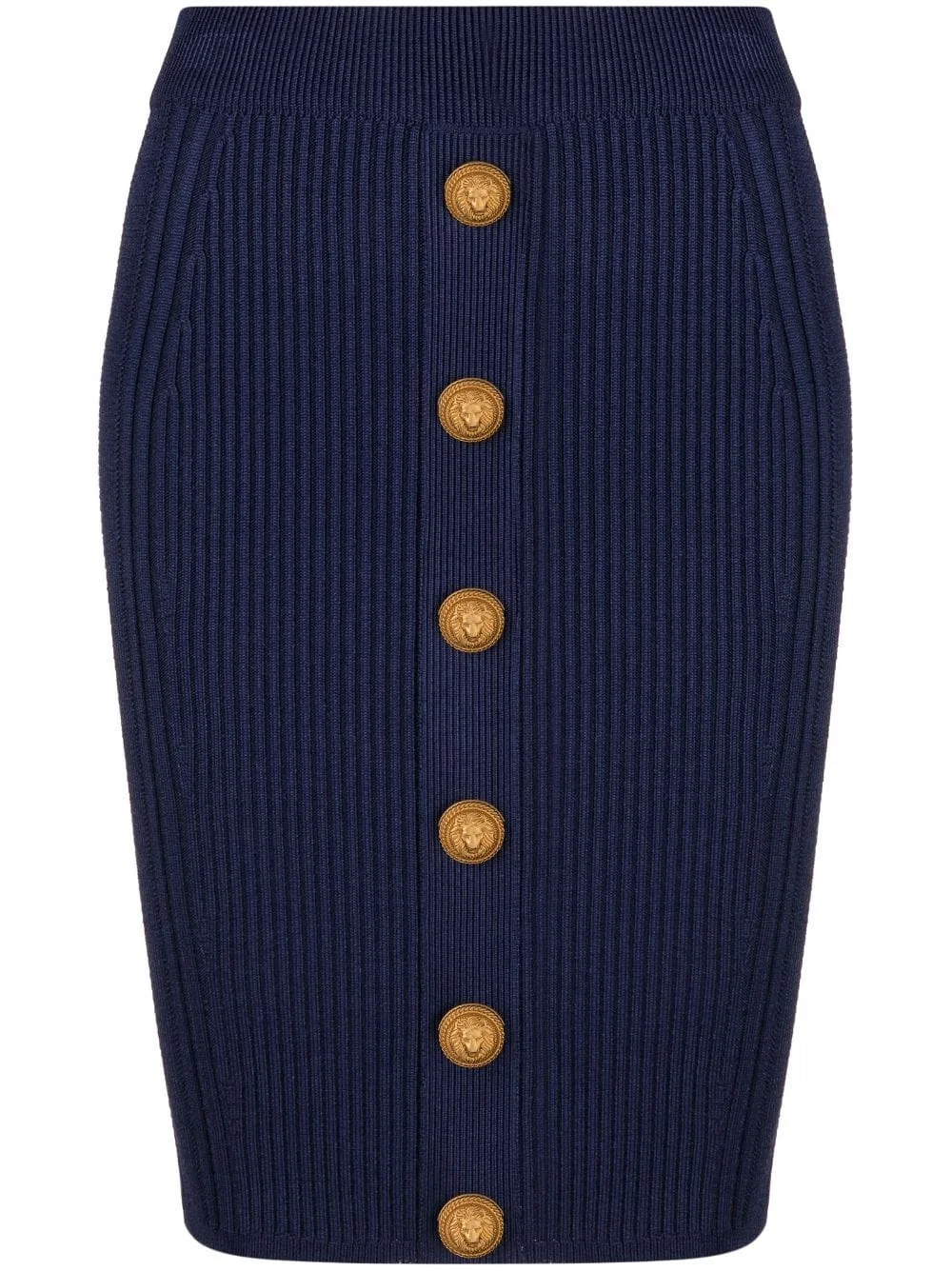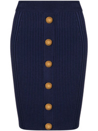 cable-knit pencil skirt Balmain's cable knit skirt is cut to a classic pencil silhouette and is finished with the house's signature gold-tone lion head buttons that run down the front. Highlights - Navy blue - Cable knit - Decorative button detailing - Pencil silhouette - Slip-on style Made in Italy Composition Viscose 83%, Polyamide 17%