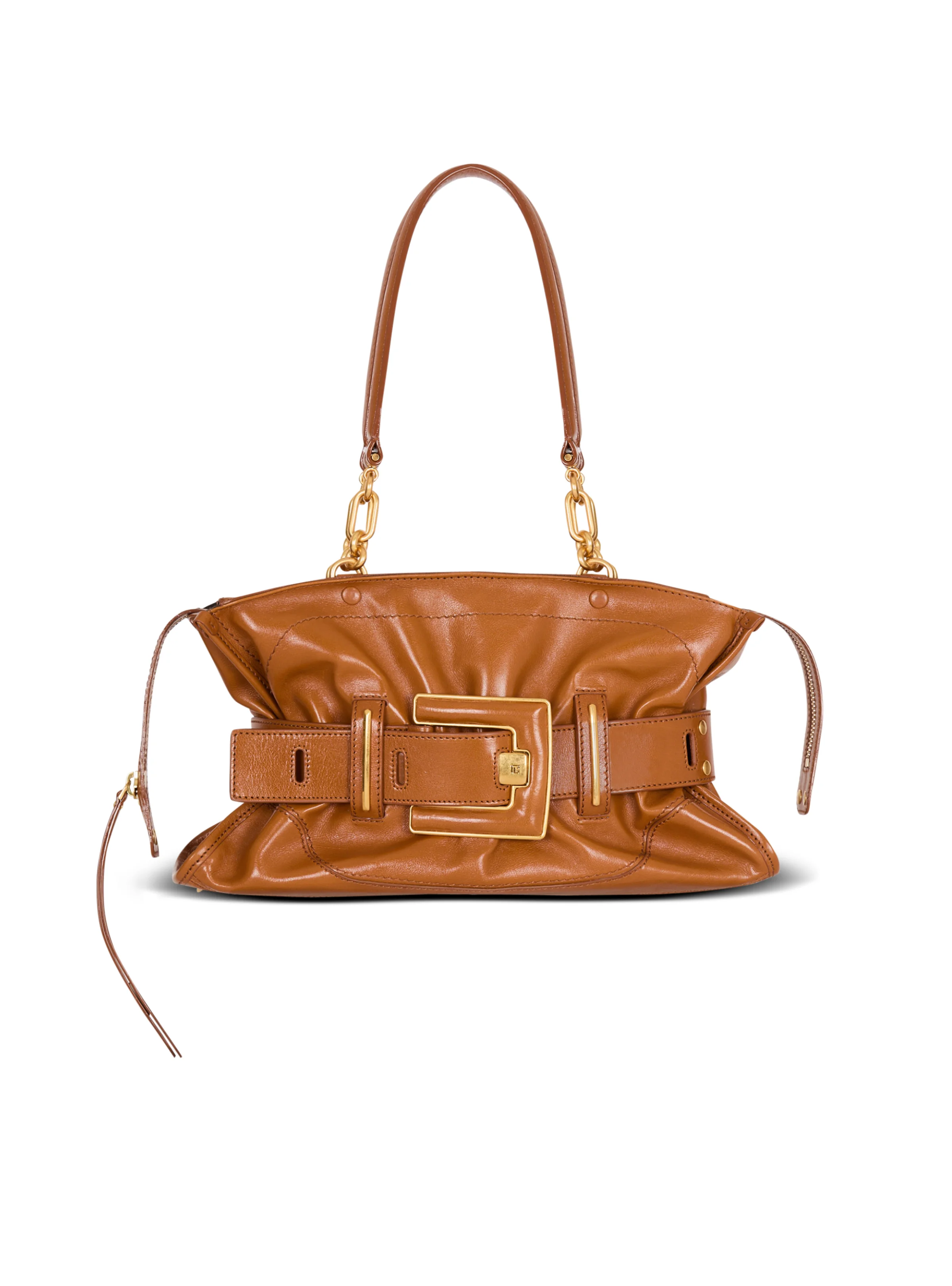 Calfskin leather Anthem bag - Soft belted style - Carry in the hand or wear on the shoulder - Two leather and chain handles - Leather belt and belt loops - Grained leather and antique metal PB-engraved buckle - Metal PB logo on the back - Zip fastening - Inside pocket with press studs - Embossed leather inside card pocket - Suede lining - Gold hardware - Dimensions: 10 x 38 x 24 cm - Main material: 100% calfskin - Made in Italy - Item: GN1DB035LFZA