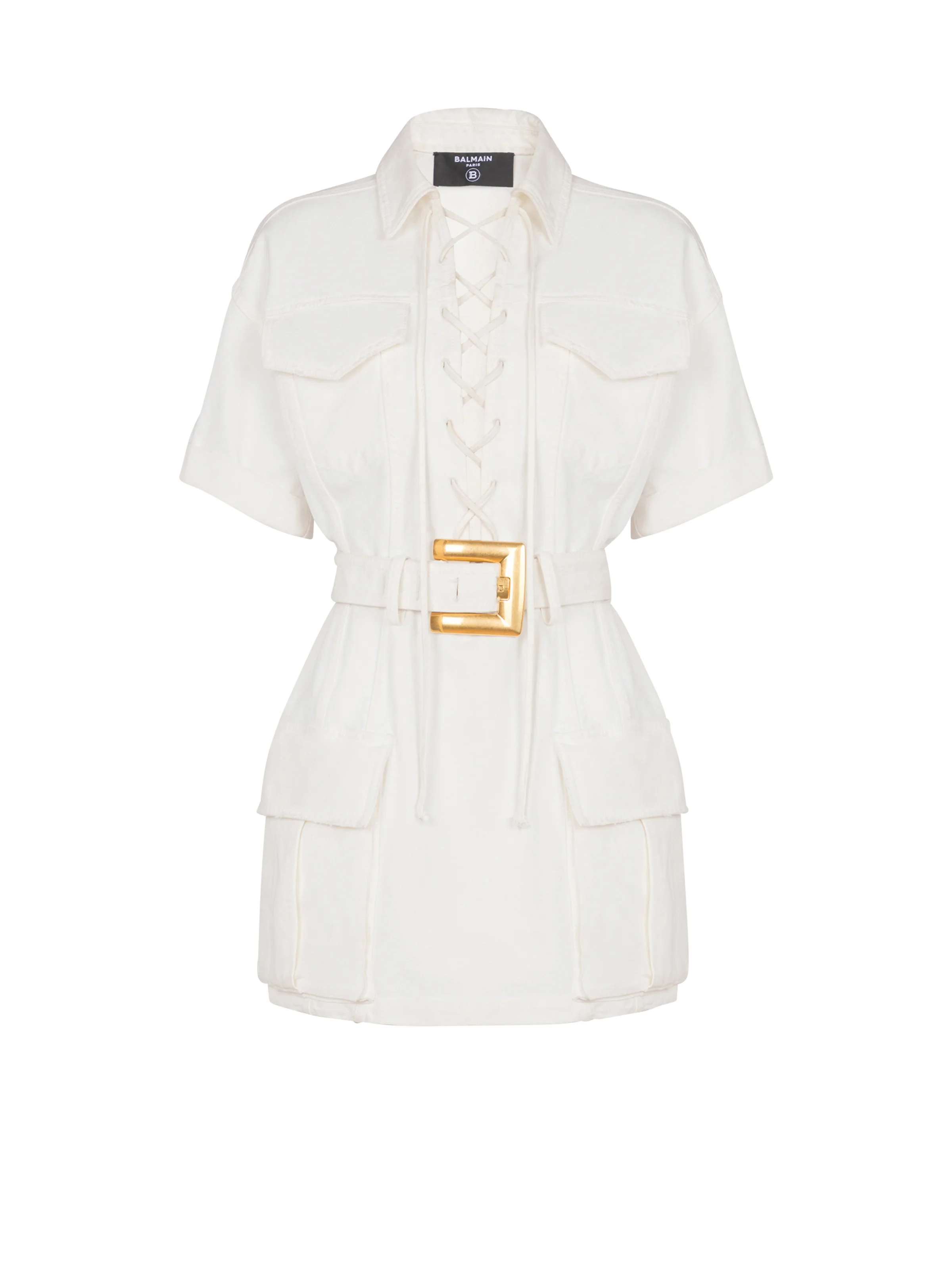 Block colour lace-up canvas dress - Shirt collar - Adjustable lace-up front - Short sleeves - 2 flap breast pockets - Detachable belt with golden metal PB-engraved Anthem buckle - 2 side bellows pockets with flap - Cropped cut with fitted waist - Model measures 179cm and wears a size 36 - Main material: 100% cotton - Made in Italy - Item: FF1R7415DF78