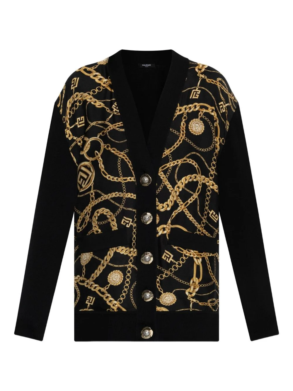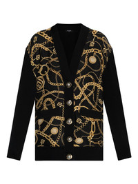chain-print cardigan Highlights - Black - Chain print - Front button fastening - V-neck - Long sleeves - Ribbed cuffs Made in Italy Composition Virgin Wool 100% Washing instructions Read Manufacturer Guidelines