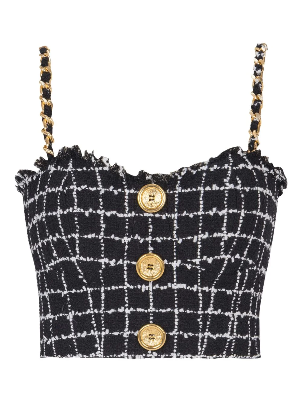 chain-strap tweed top Highlights - Black - Check pattern - Tweed texture - Chain straps - Logo-embossed buttons - Zip fastening - Frayed trim Imported Composition Polyamide 62%, Cotton 38%, Modacrylic 9% Washing instructions Specialist Cleaning