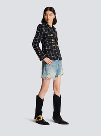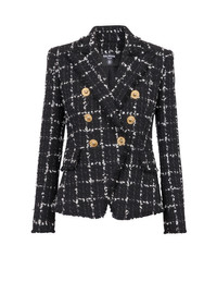 Double-breasted check tweed jacket with lapels - Fitted cut, nipped in waist - Darts on the front - Tailored neckline with pointed lapels - Structured shoulders, long sleeves - Suit-style cuffs, 5 “Balmain Chain” golden metal buttons - 6 "Balmain Chain” golden metal buttons (4 of which are decorative) - 2 flap pockets, 1 breast pocket - Model measures 178cm and wears a size 36 - Main material: 60% cotton 26% polyester 10% polyamide 4% other fibres - Made in Poland - Item: CF1SG006CE64100% of this item’s cotton fibres are GRS-certified and recycled