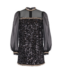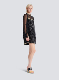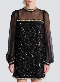 Two-material dress in chiffon and beaded sequins - Chiffon top - Crew neck - Gathered shoulders - Long sleeves - Body in crepe embroidered with sequins and beads - Finished with chiffon, gold metal chains and beaded embroidery - Visible gold metal zip fastening on the back with Balmain Paris-engraved slider - Straight, short fit - Model measures 176cm and wears a size 36 - Main material: 100% polyester - Made in Bulgaria - Item: EF0R9297PC86