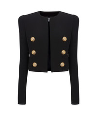 Buttoned cropped crepe jacket - Short fitted cut - Structured shoulders - Round neckline - Long sleeves - "Snail" buttons in gold metal - 6 decorative buttons - Model measures 175cm and wears a size 36 - Main material: 100% viscose - Made in Romania - Item: DF0SD215VB00 100% of the viscose fibres used to make this garment come from certified, sustainably managed forests