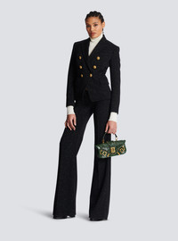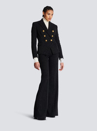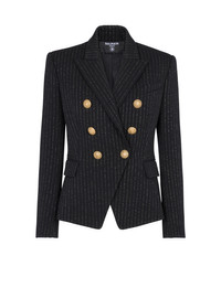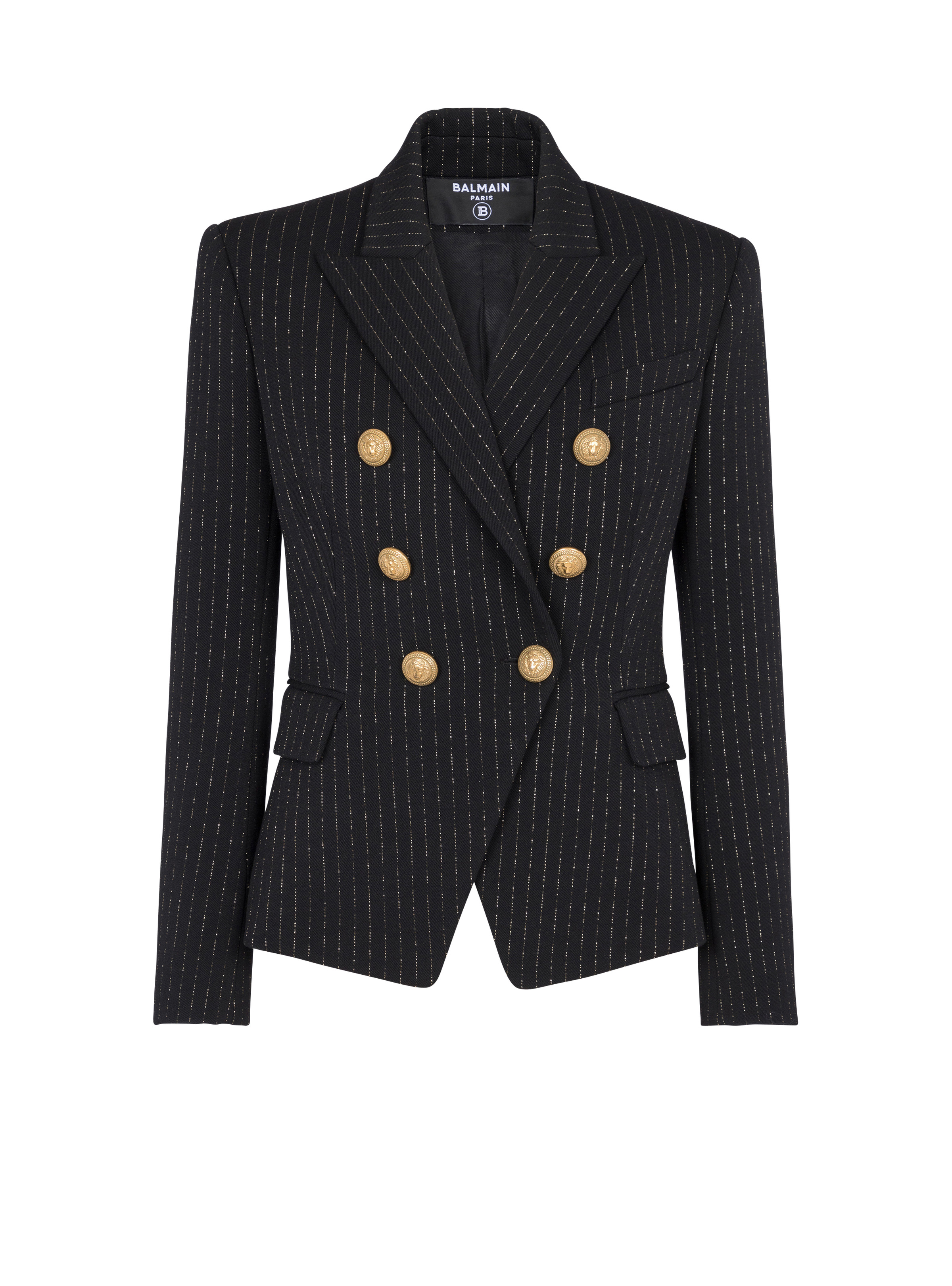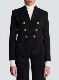 Double-breasted wool jacket with lurex stripe detail - Tight fit, marked waist - Tailored neckline with peak lapels - Double-breasted closure - 6 golden metal 'Lion Head' buttons, 5 of which are decorative - 2 flap pockets, 1 welt pocket - Tailored cuffs, 5 golden metal 'Lion Head' buttons - Model measures 176cm and wears a size 36 - Material: 98% virgin wool, 1% polyester, 1% polyamide - Made in Slovakia - Item: BF1SG008WB89
