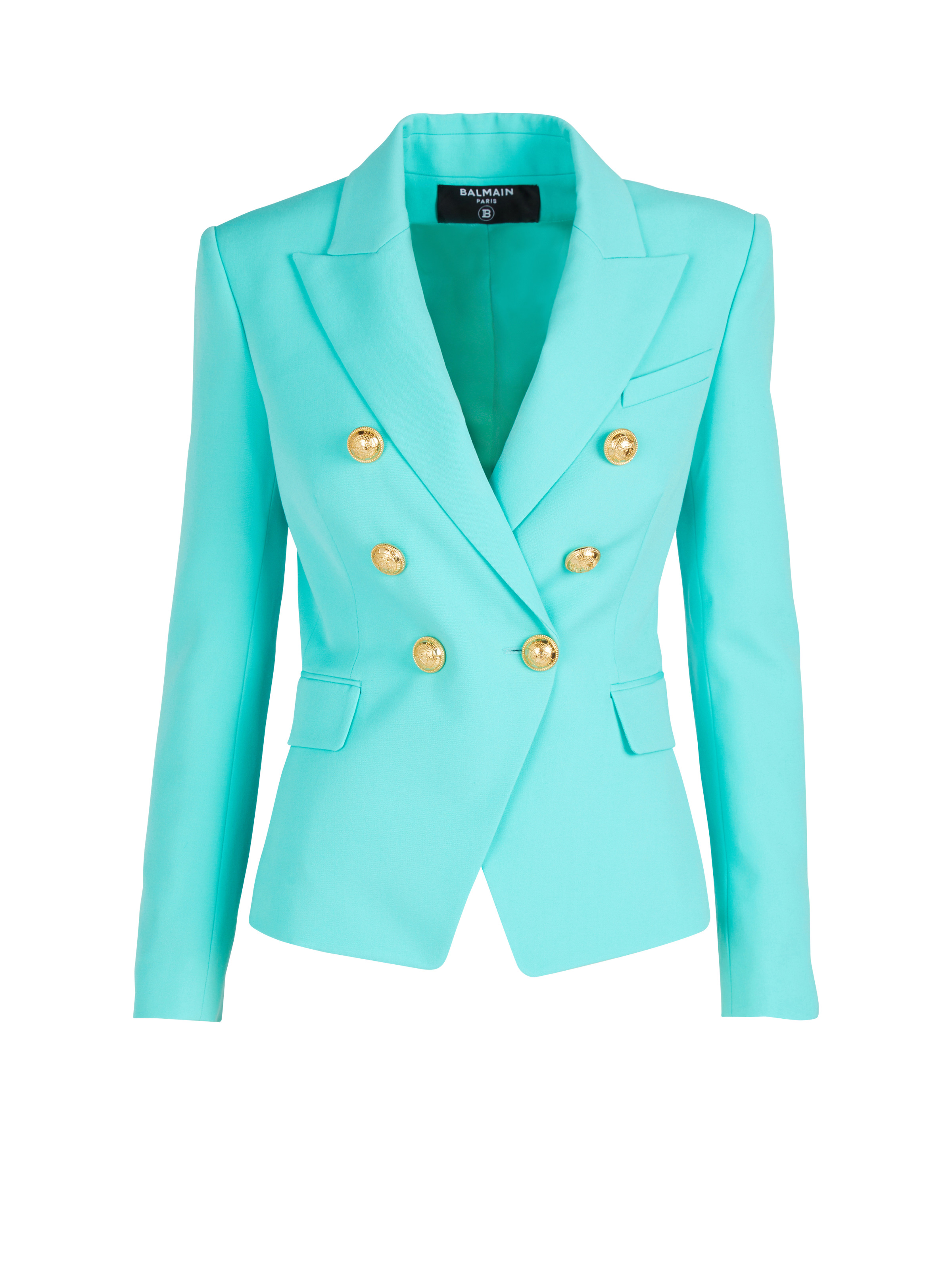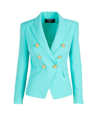Double-breasted wool jacket - Fitted cut, nipped-in waist - Front darts - Italian tailored collar - Structured shoulders, long sleeves - Tailored cuffs, 5 "Signature Lion" buttons - Double-breasted fastening - 6 decorative "Signature Lion" buttons in gold metal - 2 flap pockets, 1 breast pocket - Model measures 179cm and wears a size 36 - Main material: 100% wool - Made in Slovakia - Item: BF1SG008WC09100% of the wool fibres used to make this garment are sourced from sheep farms that are certified and animal welfare-friendly