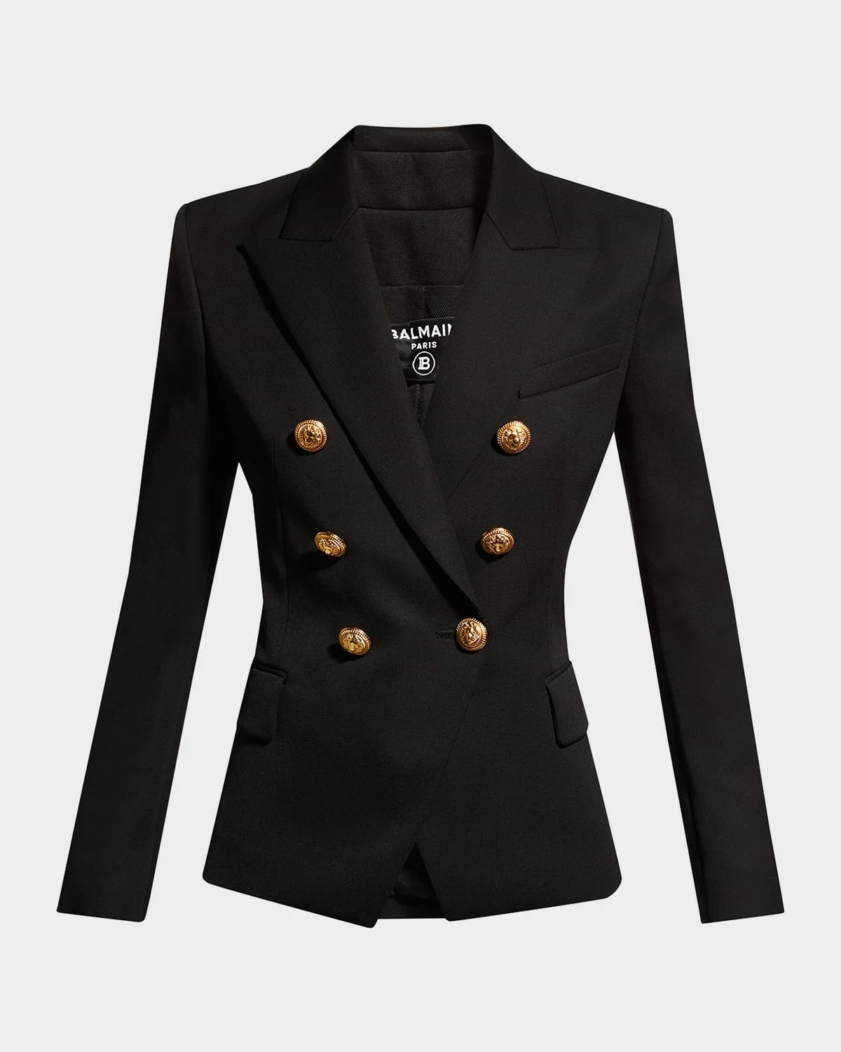 Balmain gabardine blazer. Runs small; order size up Approx. length: 24" (size 40 FR) Peaked lapels; asymmetric doublebreasted button front. Long sleeves with button cuffs. One welt pocket at chest. Two flap pockets at hips. Fitted silhouette. Cutaway hem. Wool. Dry clean Made in France.