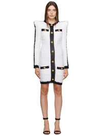 Nylon- and viscose-blend boucle tweed dress. Knit trim throughout. · Crewneck · Mock button closure at front · Mock pockets · Padded shoulders · Zip closure at back · Unlined · Logo graphic hardware in gold-tone Supplier color: White/Black Body 1: 33% polyamide, 32% viscose, 27% polyester, 8% cotton. Body 2: 67% cotton, 33% polyamide. Body 3: 83% viscose, 17% polyester. Made in France 232251F052004