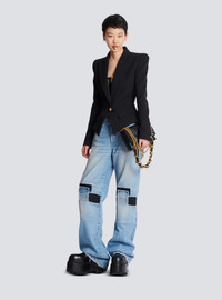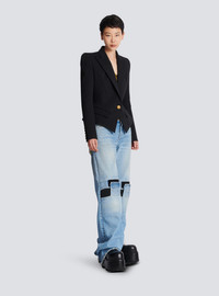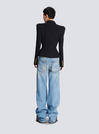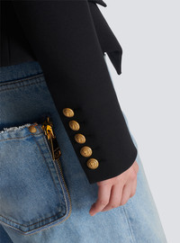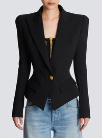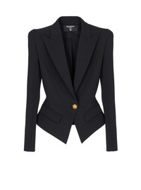 Cotton grain de poudre slim-fitting jacket - Tailored collar with wide pointed lapels - button fastening - marked waist - shoulder pads - long sleeves - buttoned slit at the bottom of the sleeves - 5 gold “lion head” embossed buttons - side pockets with flaps - Fitted hourglass cut - This item fits true to size (select your usual size) - The model is wearing a size S - The model's height is 177 cm - Materials: 54% cotton, 42% polyamide, 4% elastane - Made in Slovakia - Item: AF1SE007CC77