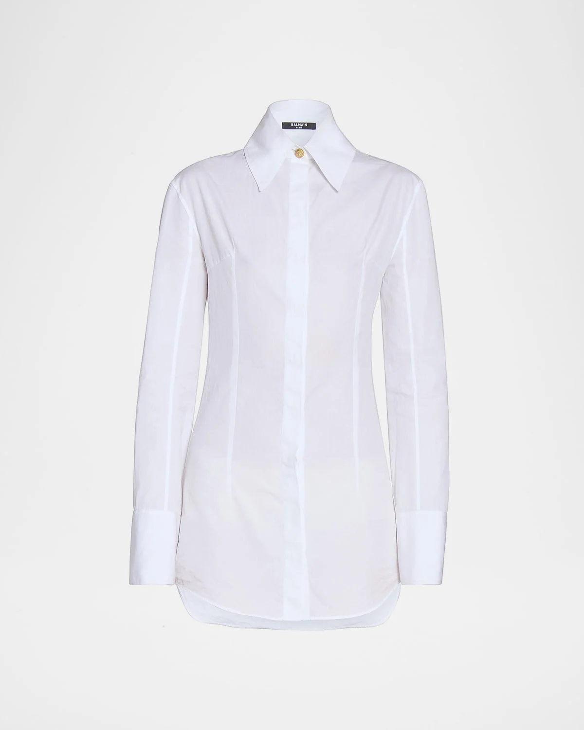 Balmain shirt is crafted from crisp cotton popeline with a figure slimming silhouette and signature buttoned wide cuffs Point collar; concealed button front Long sleeves; button cuffs Slim fit Shirttail hem Cotton Professional cleaning recommended Made in Italy