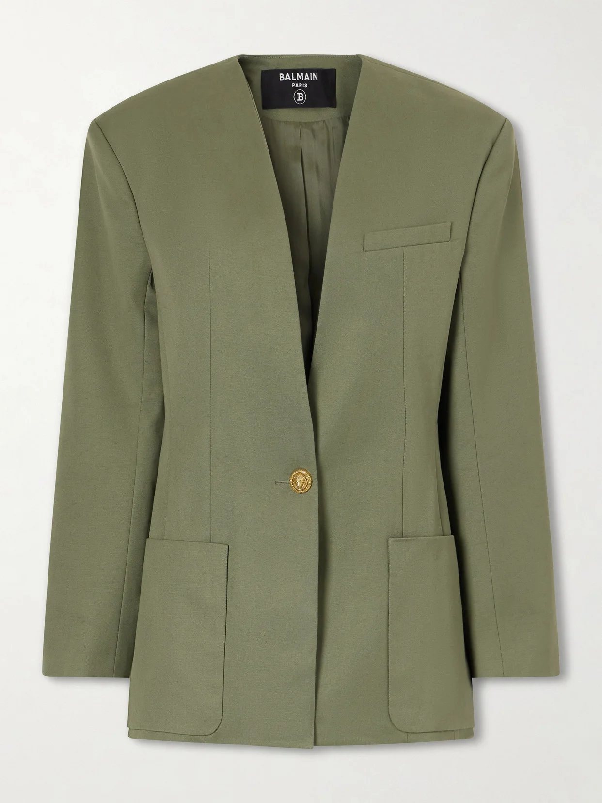 Balmain sharpens classic tailoring with bold, architectural lines in this cotton-twill blazer. It features structured shoulders and a deep V-neck in place of traditional lapels, with a single-button closure that defines the waist and front pockets for subtle functionality. Pair with tailored trousers or a skirt to emphasize its sculpted silhouette.