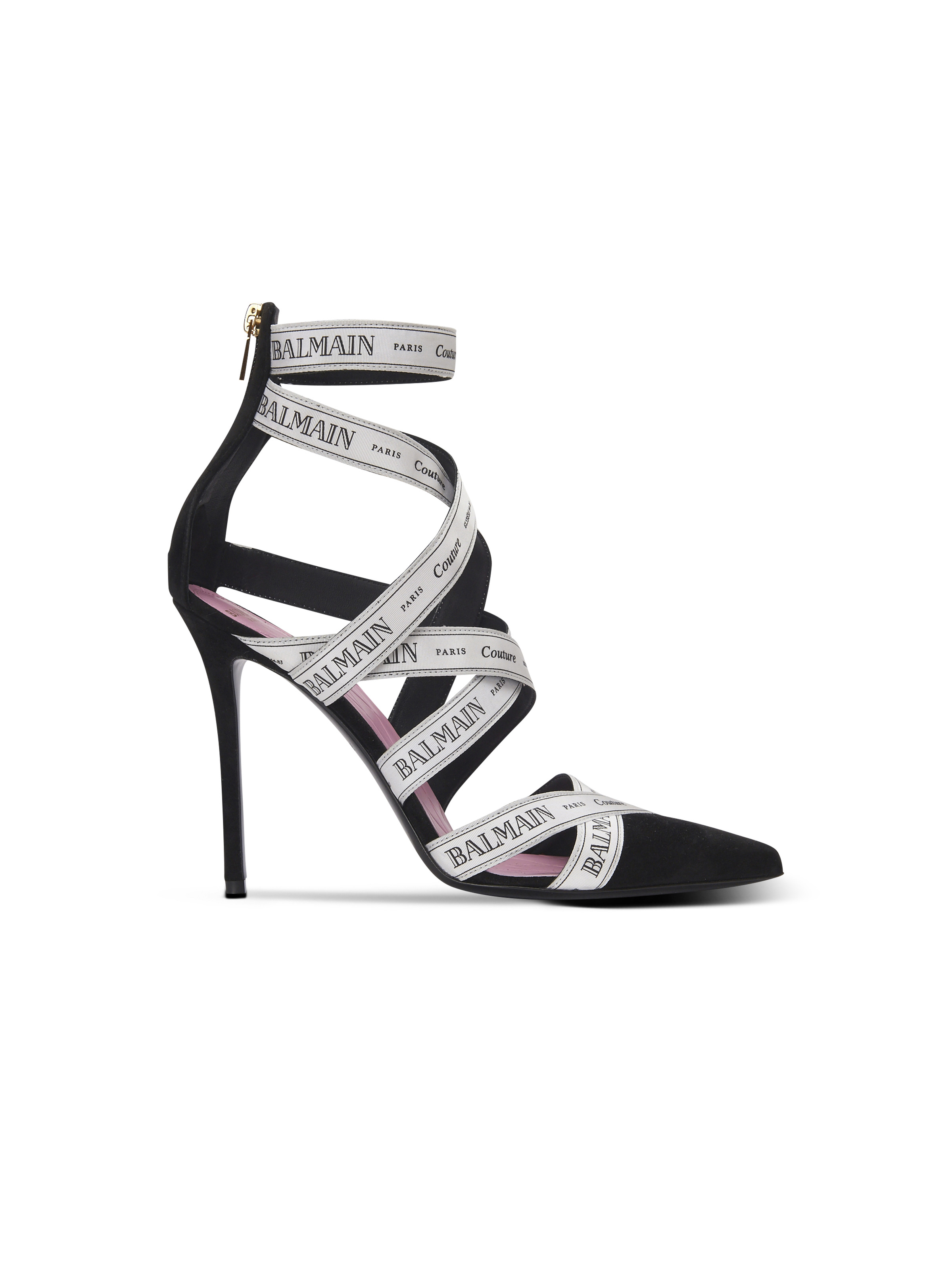 Couture suede heels with Balmain ribbon motif - Pointed suede toe - Balmain Couture ribbon straps - Back zip with Balmain-engraved slider - Suede-covered stiletto heel - Leather outsole - Contrasting Diamond-embossed leather insole - Leather lining - Gold hardware - Heel height: 9.5 cm - Main material: 100% goatskin - Made in Italy - Item: EN1UH092TKWB