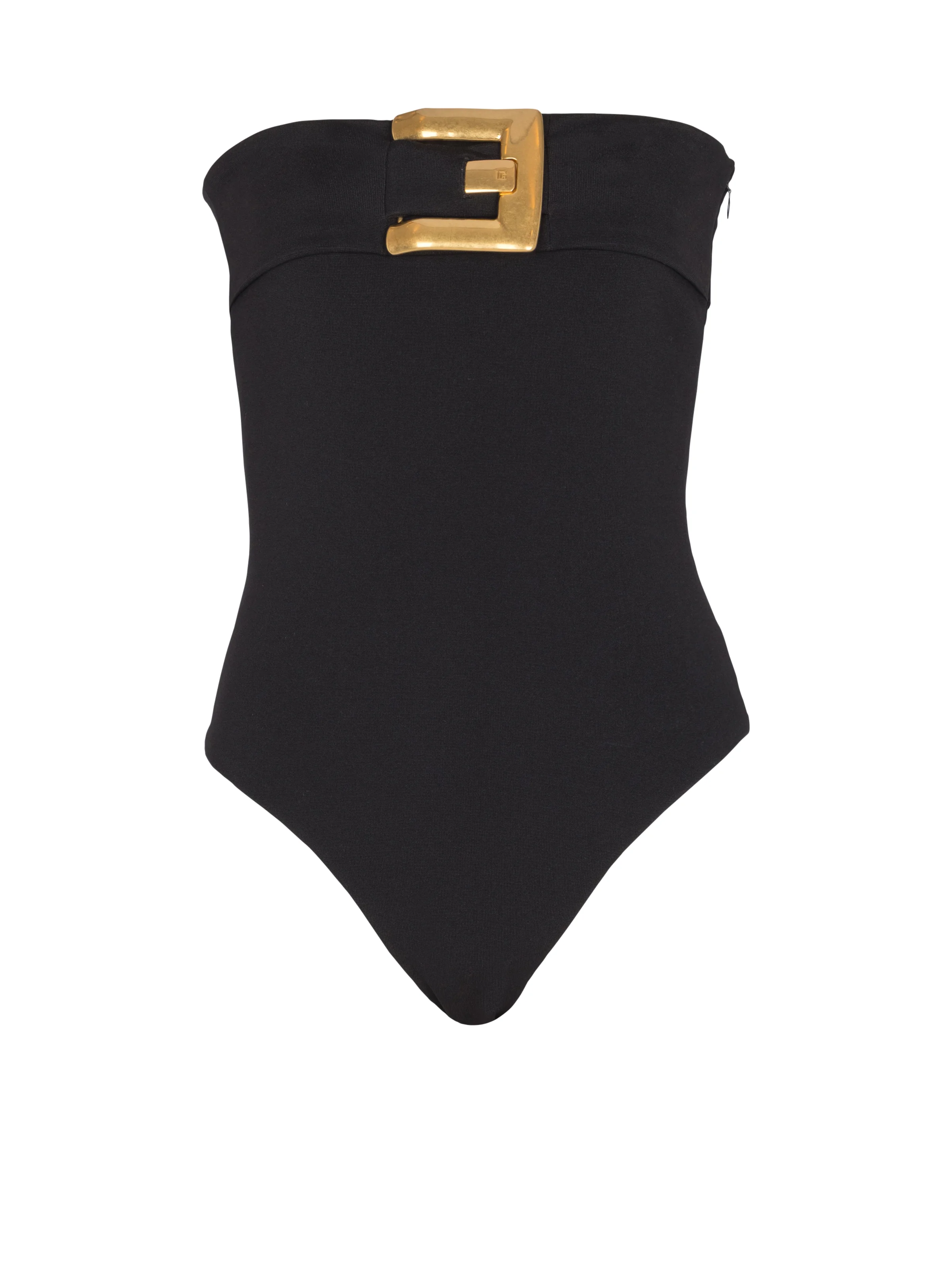 Bustier bodysuit with Anthem belt and Balmain logo - Straight neckline - Three press studs at the crotch - Fitted cut - Model measures 180cm and wears a size 36 - Main material: 80% viscose 16% polyamide 4% elastane - Made in Portugal - Item: GF1BA285JL05100% of the viscose fibres used to make this garment come from certified, sustainably managed forests