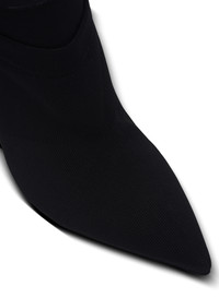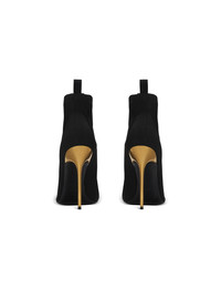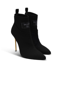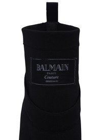 Crewneck knit ankle boots - Knit sock upper - Pointed toe - Neckline effect - Woven Balmain Couture label on the front - Woven pull tab - Lacquered gold stiletto heel - Leather outsole - Contrasting leather insole embossed with a Diamond motif - Heel height: 9.5 cm - Main material: 79% polyester 14% polyamide 7% elastane - Made in Italy - Item: EN1TE102TKAB