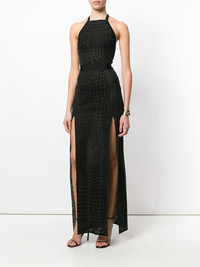 crocodile effect gown Olivier Rousteing implements a ‘more is more’ philosophy which showed no boundaries in Balmain’s AW17 collection. Expect a visually rich line-up of opulent fabrics, daring cuts and his signature decadent embellishing. Crafted in Italy, this crocodile effect gown exemplifies the creative director's aesthetic. A head-turning event piece, the dress boasts a halter neck, a fitted waist, a sleeveless design, an open back, a rear zip fastening, side slits and a long length. Made in Italy Composition Viscose 87%, Nylon 10%, Polyamide 3% SIZE & FIT Model measurements Height 5 ft 11 in(1.8 m) Bust/Chest 31.49 in(80 cm) Hips 35.82 in(91 cm) Waist 23.62 in(60 cm)