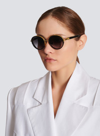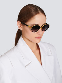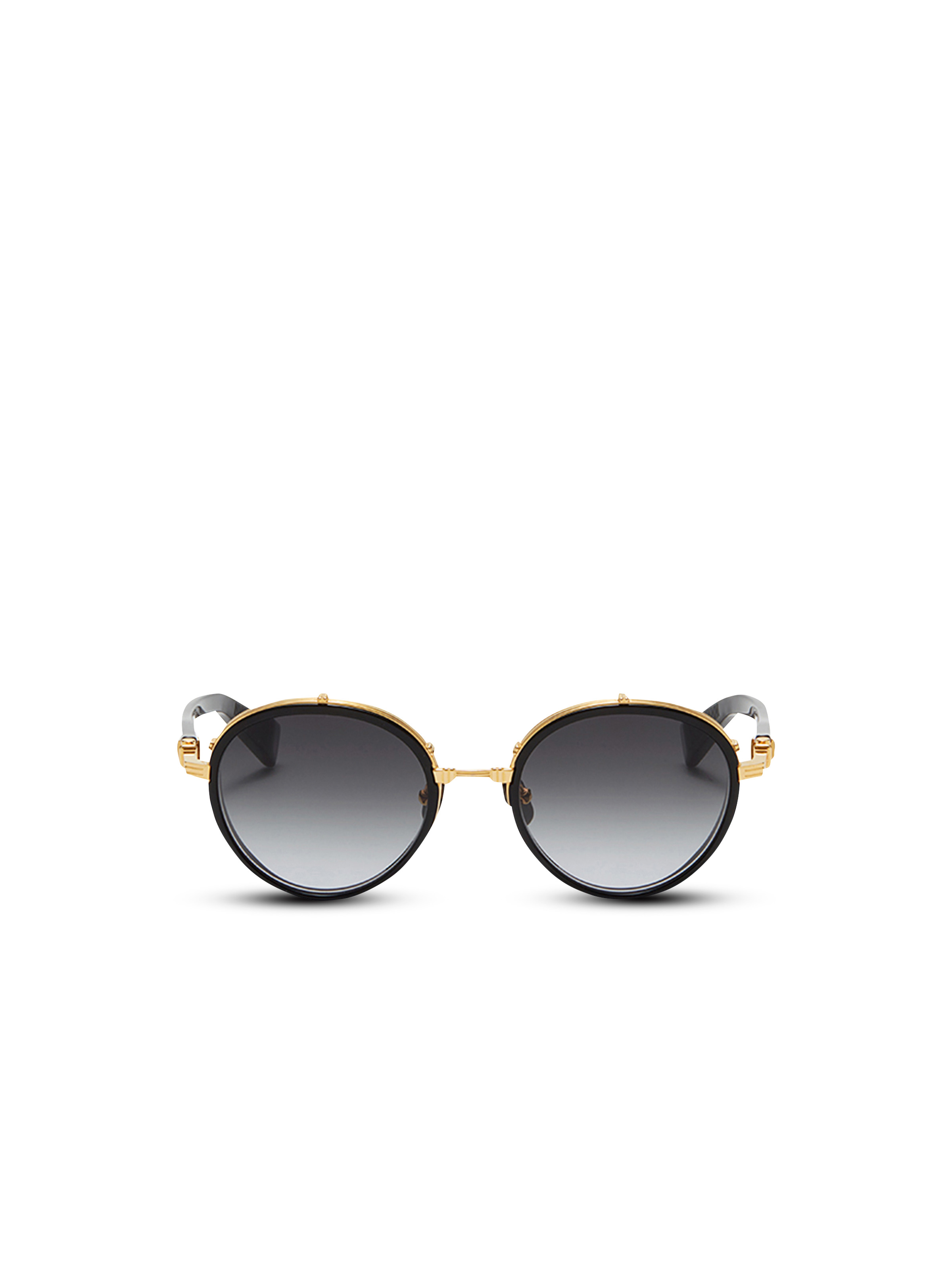 Oval Croissy glasses Vintage frame with black titanium side shields, thin temples, gold-tone finishes, dark gray shaded anti-glare lenses, 100% UV protection Protective case bearing the Balmain logo included Lens: 5.1 cm / 2 in Bridge: 2 cm / 0.8 in Temple: 14 cm / 5.5 in Made in Japan Titanium, Acetate, CR-39 lens Item: YBPS126126A