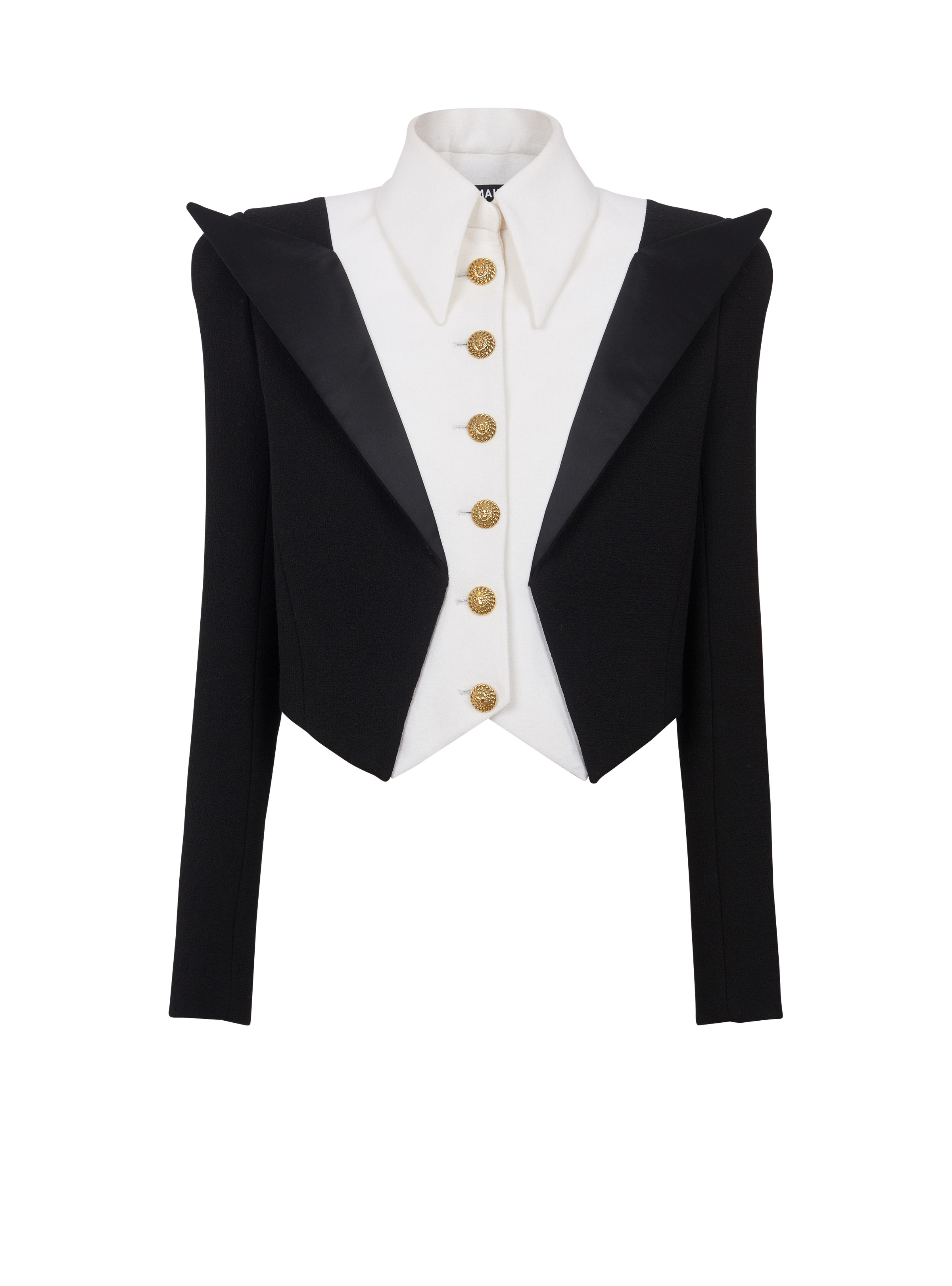 Crepe trompe-l'œil Spencer jacket - Contrasting double jacket effect - Short and tight fit - Round collar with pointed lapels - Structured shoulders, long sleeves - Tailored cuffs, 5 covered buttons - Double tailored collar with wide satin lapels - Fastening with 6 “Signature Lion” golden metal buttons on the front - Model measures 180cm and wears a size 36 - Main material: 100% virgin wool - Made in France - Item: CF1SC145WB86