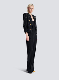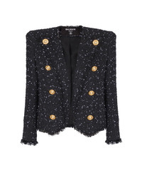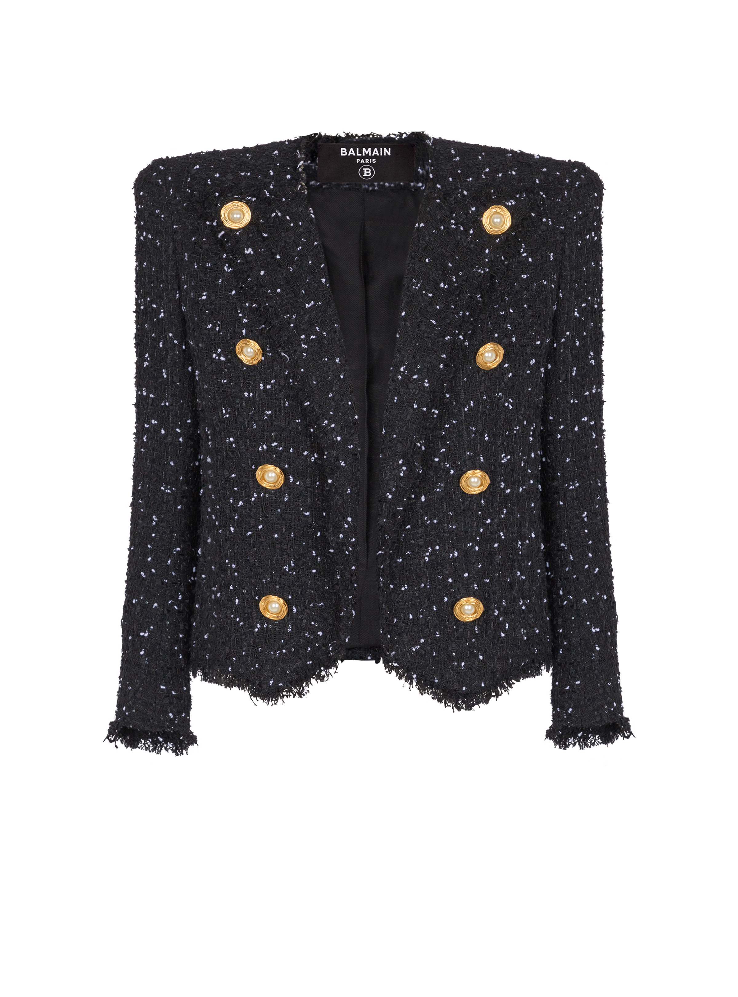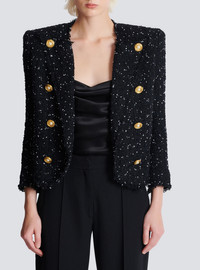 Cropped polka-dot tweed edge-to-edge jacket with 8 buttons - Round neckline with cut Italian tailored collar - Structured shoulders - Long sleeves - Straight cuffs with 5 buttons - 8 decorative buttons on the front - "Gold Thread and Pearl" buttons in gold metal and pearl - Raw hems - Inside slash pocket - Twill lining - Cropped fit - Model measures 176cm and wears a size 36 - Main material: 41% polyamide 30% cotton 17% polyester 8% recycled polyester 2% metallic polyester 2% other - Made in Poland - Item: EF0SC226XL06