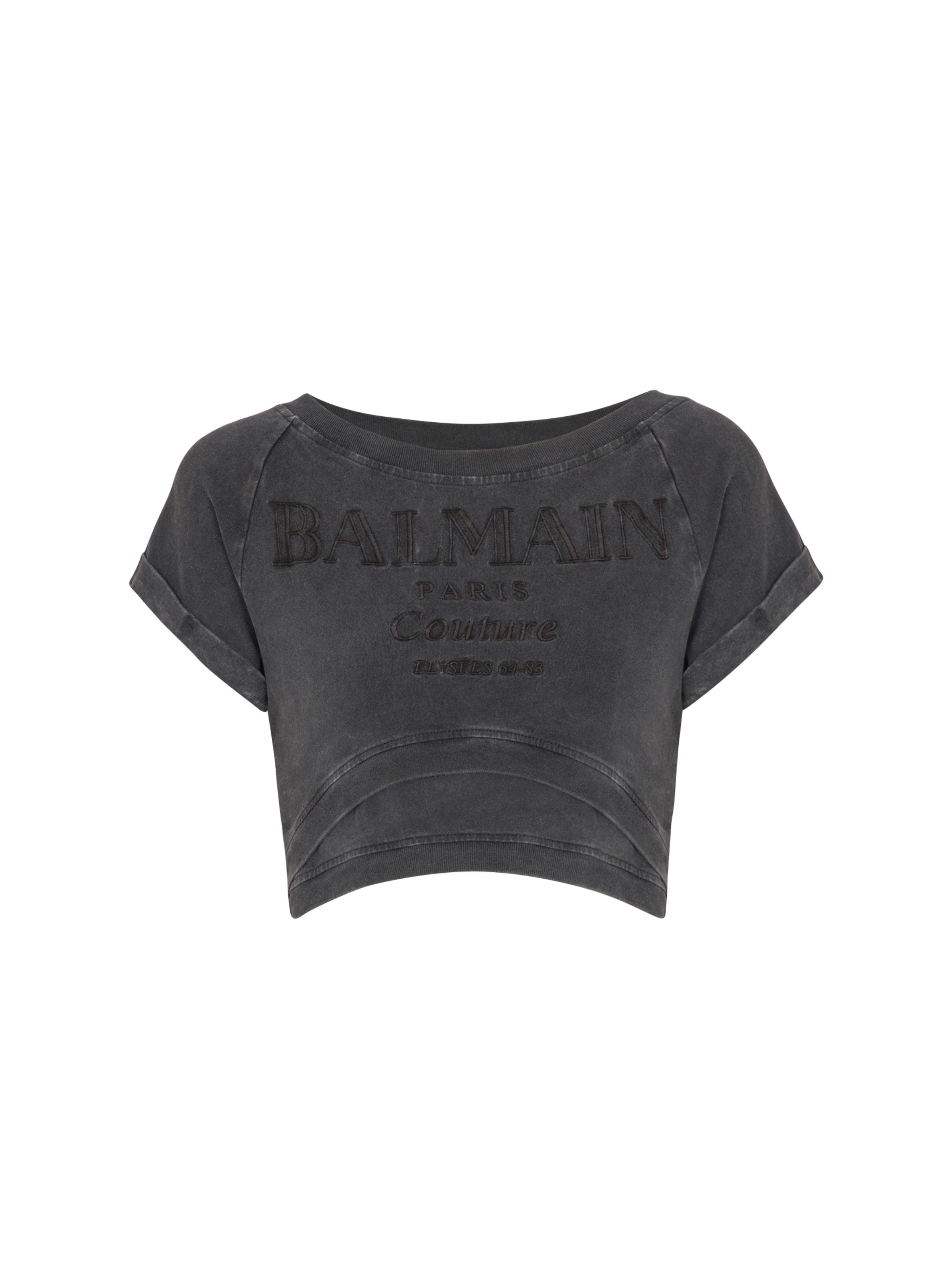 Balmain Couture embroidered T-shirt - Round neckline - Short cuffed sleeves - Balmain Couture logo in tone-on-tone embroidery on the front - Double hem effect - Ribbed neckline and hem - Unique, pigment-dyed piece - Cropped slim fit - Model measures 179cm and wears a size S - Main material: 100% cotton - Made in Bulgaria - Item: EF1EE121BC96100% of the cotton fibres used to make this garment are certified and organically farmed