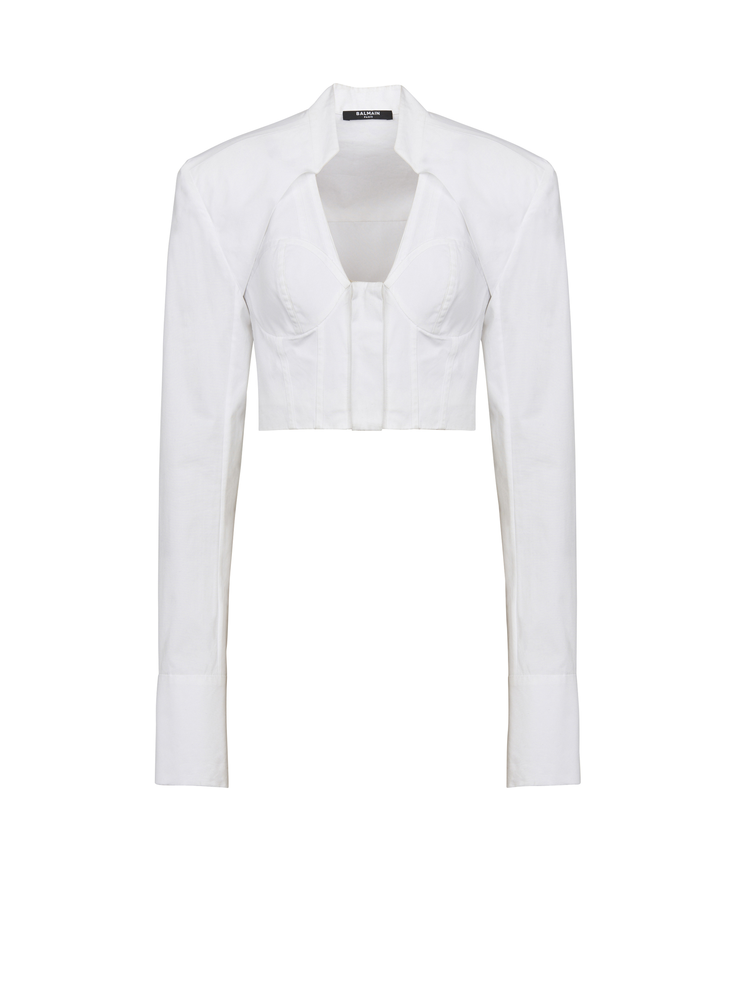 Cropped cotton shirt Long sleeves, gold embossed buttons Tight fit This item fits true to size (select your usual size) The model is wearing a size S The model's height is 177 cm/5 ft 9 in, bust 81 cm/32 in, waist 58 cm/23 in and hips 89 cm/35 in Made in Italy Material: 100% cotton Item: YF0HQ000CC52