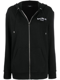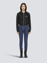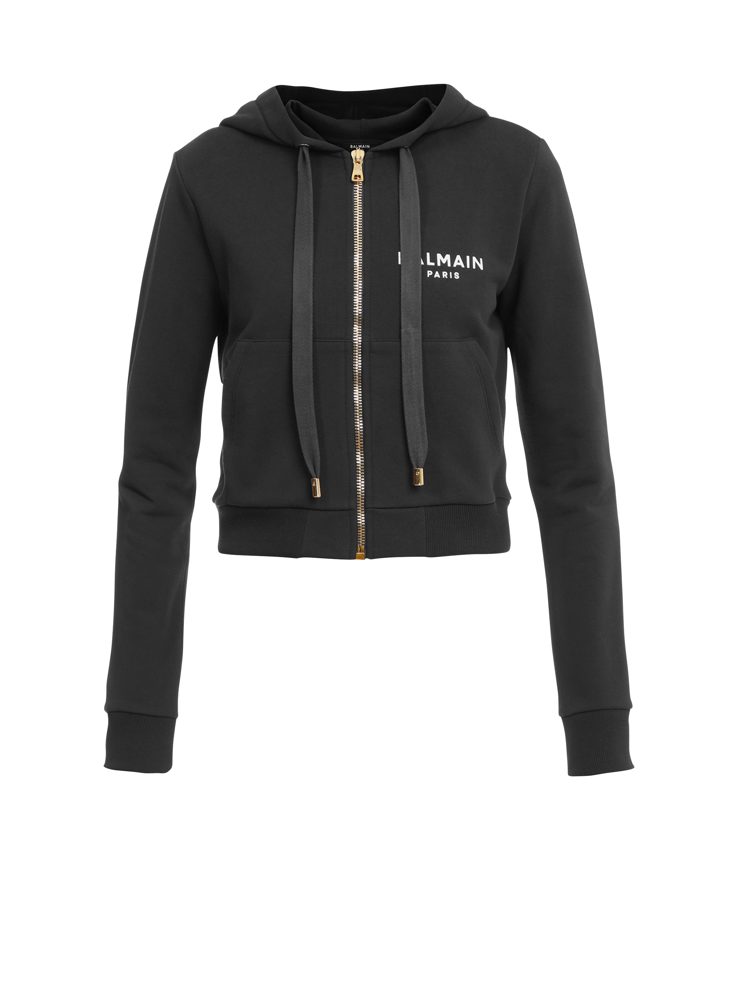 Cropped cotton sweatshirt Long sleeves, drawstring hood, zipper closure, ribbing, two raglan pockets, white Balmain logo print Relaxed fit Fits true to size, select your usual size The model is wearing size FR 36 The model's height is 177 cm / 5'9 in, bust 81 cm / 32 in, waist 58 cm / 23 in, hips 89 cm / 35 in Made in Portugal Material: 100% Cotton Item: VF13795B003