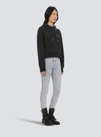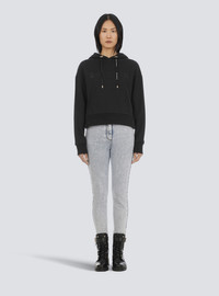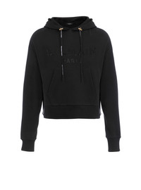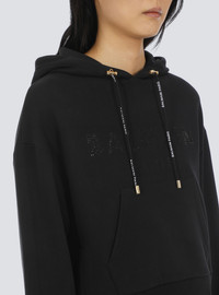 Cropped eco-designed cotton sweatshirt with rhinestone Balmain logo - Long sleeves - Drawstring hood - Ribbing - With black rhinestone Balmain logo - Casual cut - Fits true to size - Select your usual size - The model is wearing FR size 36 - The model's height is 177 cm - Main material: 100% cotton - Made in Portugal - Item: XF1JP000BB03100% of the cotton fibers in this garment come from organic farming and certified