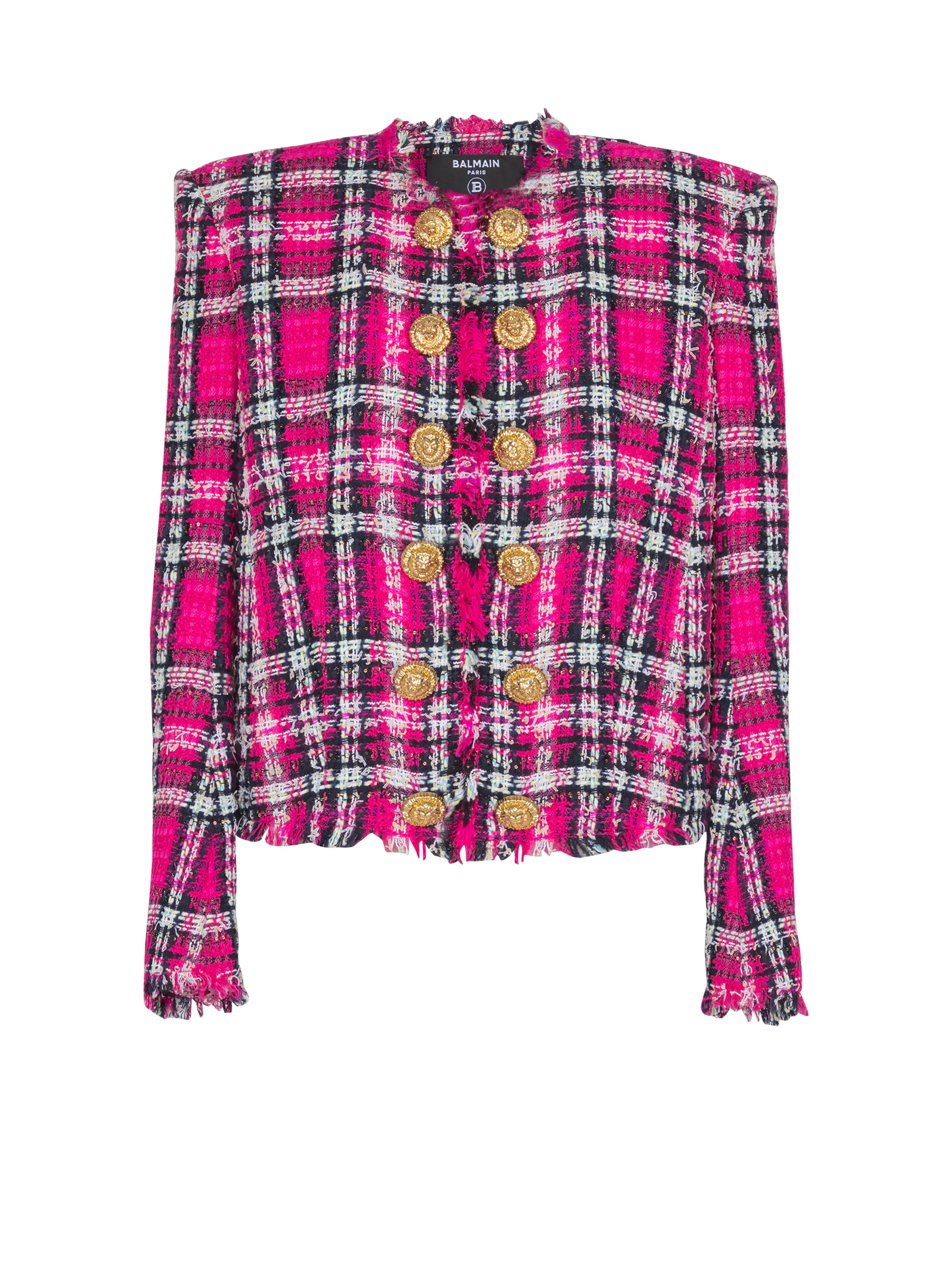Cropped jacket in glitter plaid tweed - Round neck - Double-breasted "Lion Head" button fastening - Long sleeves - Straight cuffs with 5 gold metal "Lion Head" buttons - Straight cut - Model measures 180cm and wears a size 36 - Main material: 47% cotton 23% merino wool 11% polyamide 10% cotton 8% polyester 1% other - Made in Poland - Item: GF1SM509CG42