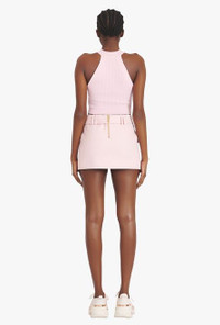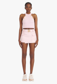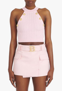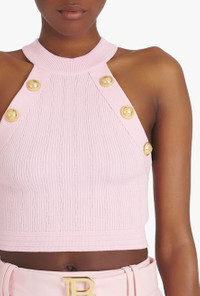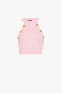 Pale pink knit crop top Sleeveless, tank top neck, embossed gold-tone buttons in front ITEM INFORMATION - Fitted cut - The model is wearing FR size 36 - The model's height is 175.5 cm / 5 ft 9 in, bust 81 cm / 32 in, waist 58 cm / 23 in, hips 87 cm / 34.5 in - Made in Italy - Materials: 83% Viscose, 17% Polyester - Item: WF1AB022K2110PA
