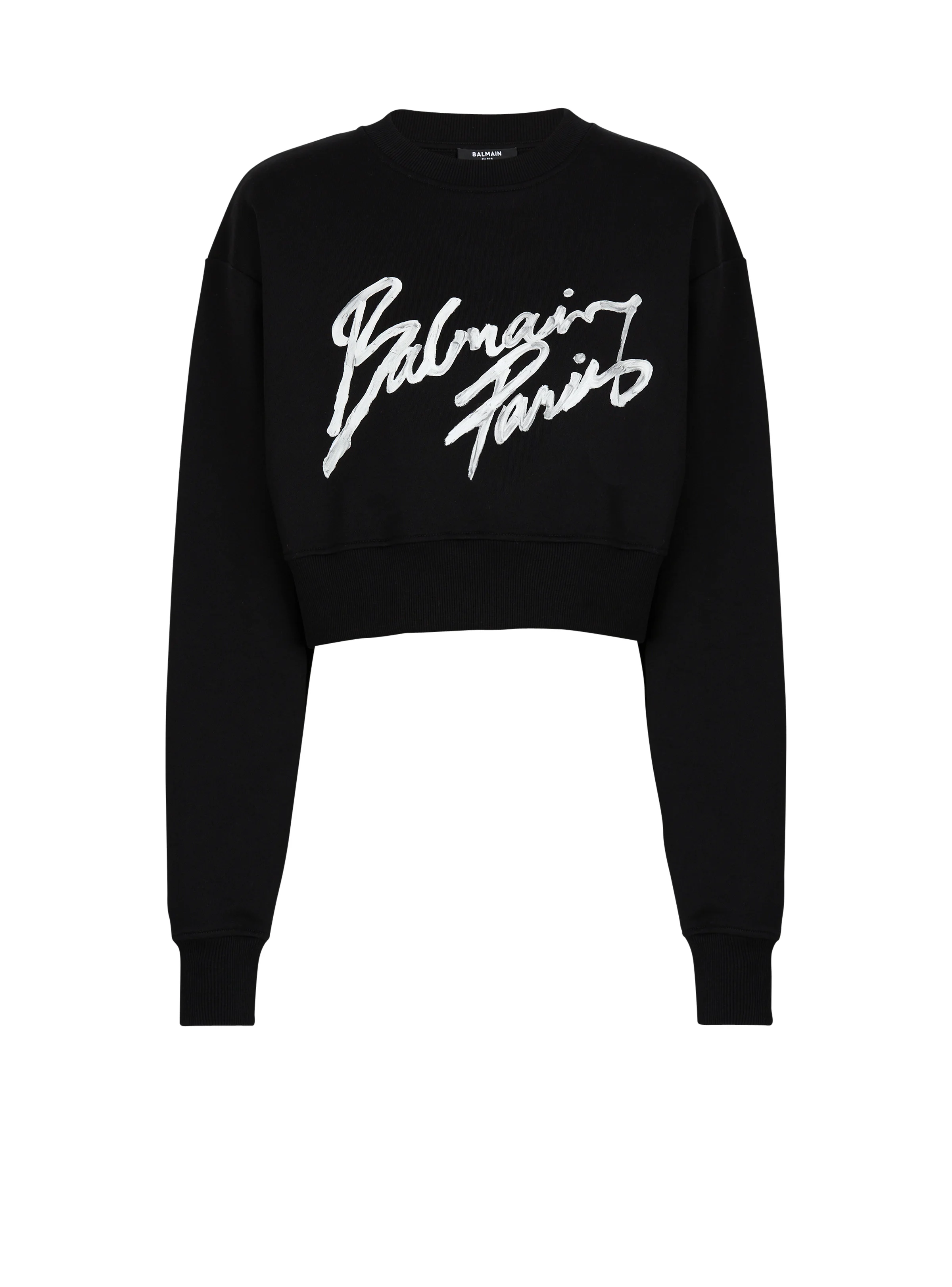 Cotton jersey sweatshirt - Long sleeves - Balmain Paris Brush print on the front - Ribbed edging - Regular cropped cut - Model measures 180cm and wears a size S - Main material: 100% cotton - Made in Portugal - Item: GF1JO080BD41100% of the cotton fibres used to make this garment are certified and organically farmed