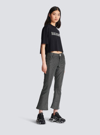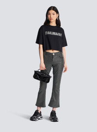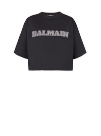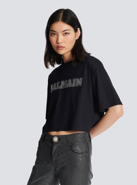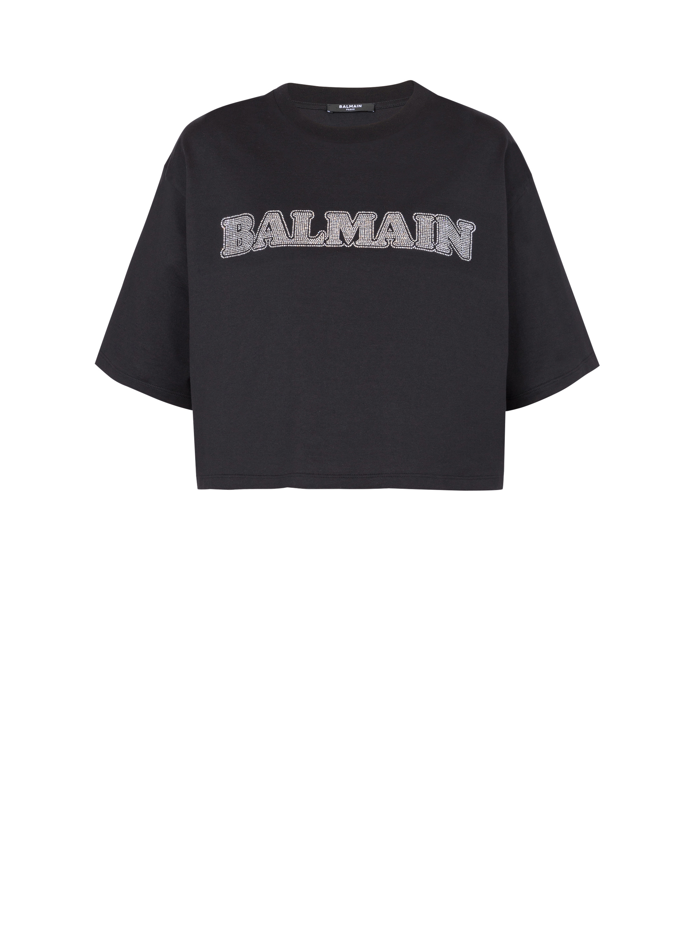 Cropped crystal Balmain T-shirt - Rhinestone-embellished Balmain logo on the front - Short, relaxed fit - Round neck - Short sleeves - Double-topstitched edges - Model measures 178cm and wears a size S - Material: 100% organic cotton - Made in Italy - Item: BF0EE020BC54