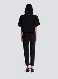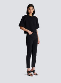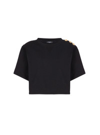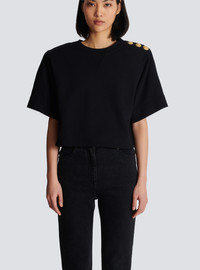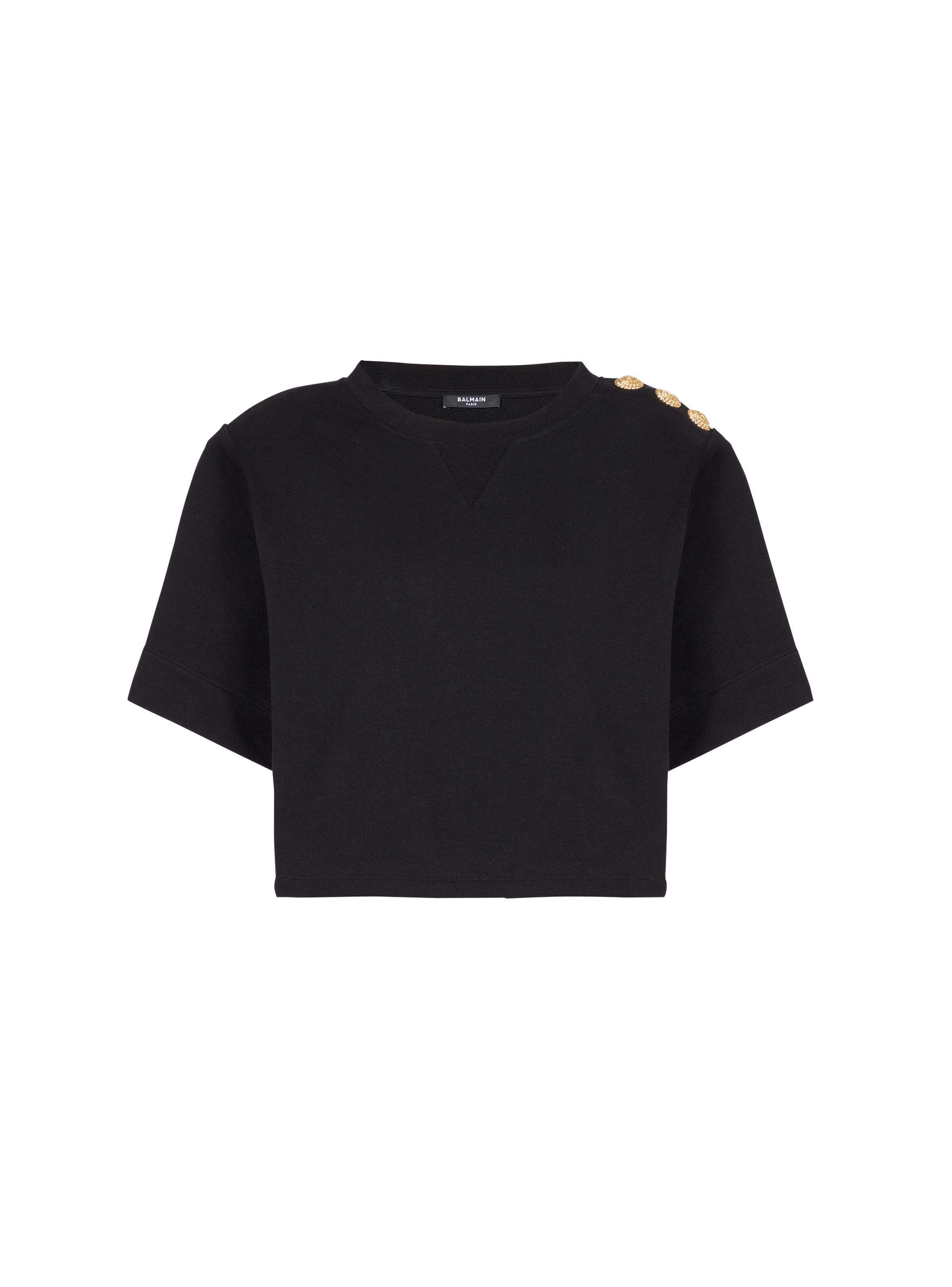 Cropped sweatshirt with buttons - Relaxed fit - Structured shoulders - Round neck with ribbed trim - 3 decorative "Double Chain Lion" buttons in gold metal on the shoulder - Short sleeves - Model measures 178cm and wears a size M - Main material: 100% cotton - Made in Italy - Item: DF1EE101JB53100% of the cotton fibres used to make this garment are certified and organically farmed
