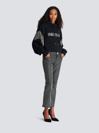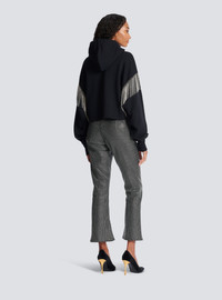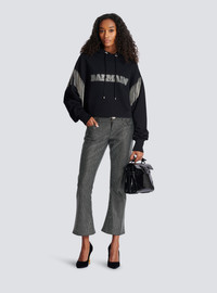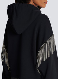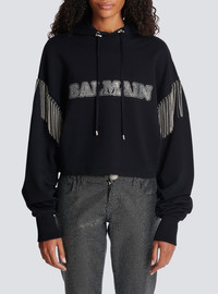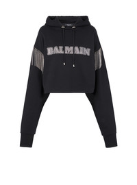 Cropped Balmain Paris hoodie - Balmain in crystals on the front - Loose fit - Round neck - Long sleeves - Fringing and chains in silver crystals - Drawstring-adjustable hood - Silver metal eyelets, stoppers and aglets - Model measures 175cm and wears a size S - Main material: 100% organic cotton - Made in Italy - Item: BF0JP033BC54