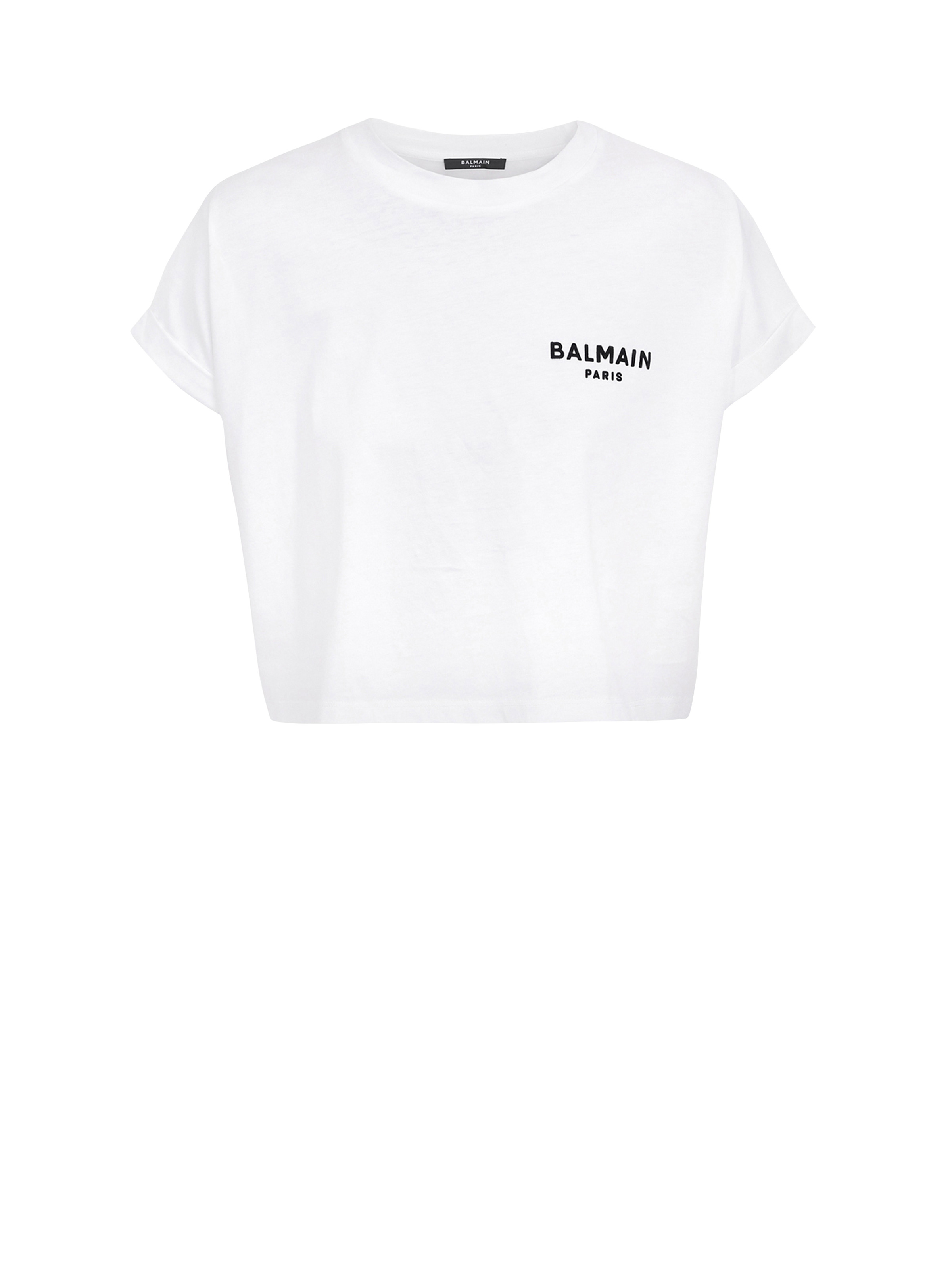 Cropped T-shirt with contrasting flocked Balmain Paris detail - Cotton jersey - Short, relaxed fit - Round neckline - Short sleeves - Turn-ups on the sleeves - Model measures 176cm and wears a size S - Material: 100% certified organic cotton - Made in Portugal - Item: BF1EE005BB01