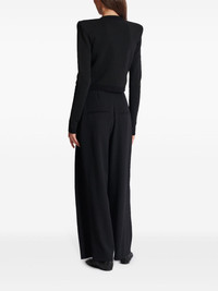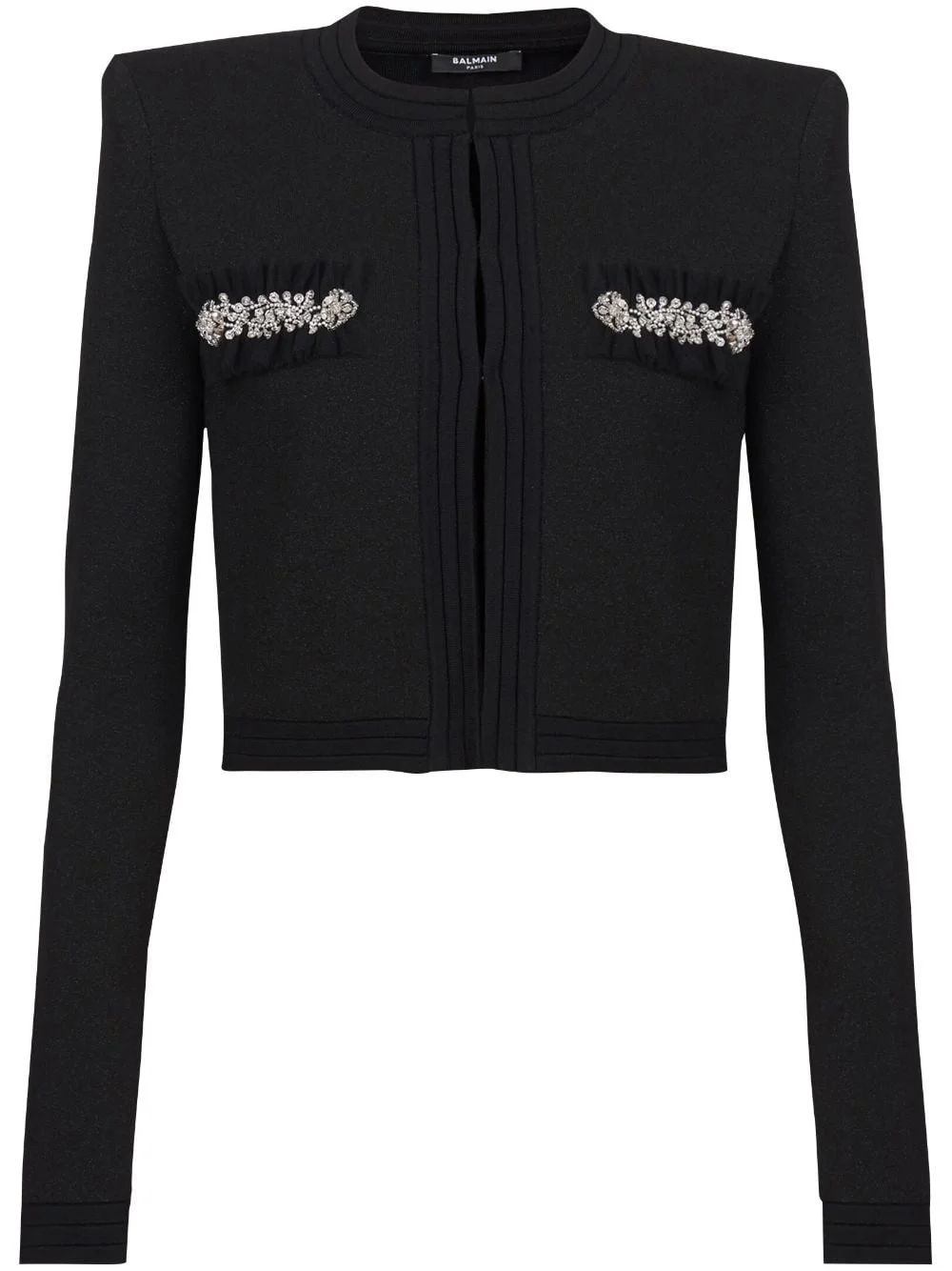 crystal-embellished cardigan Highlights - Black - Knitted construction - Crystal embellishment - Front hook and eye fastening - Round neck - Shoulder pads - Long sleeves - Ruffled detailing - Straight hem Made in Italy Composition Viscose 79%, Polyester 12%, Fabric 9% Washing instructions Read Manufacturer Guidelines
