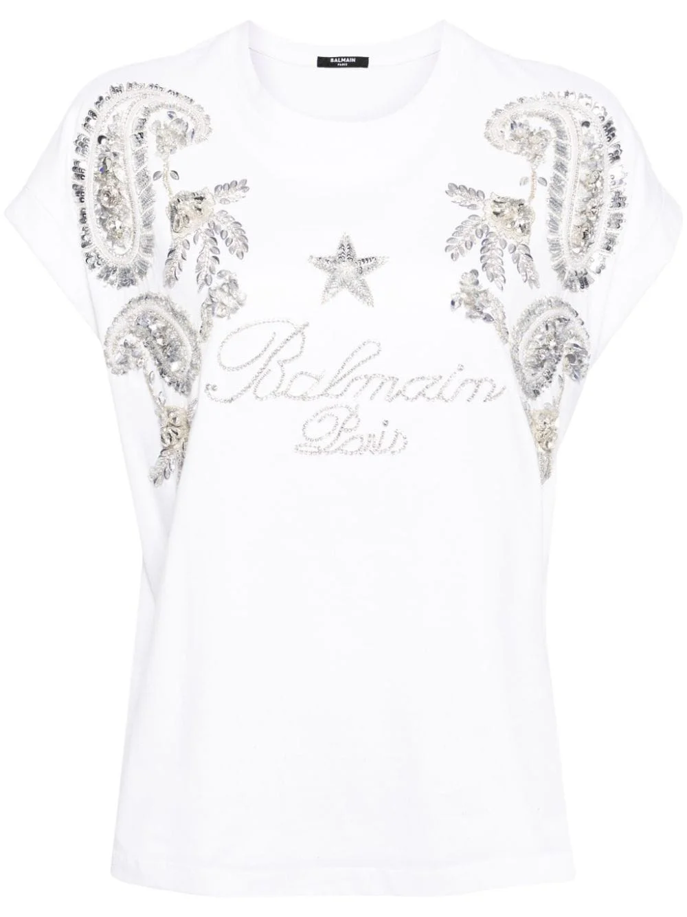 crystal-embellished cotton T-shirt Balmain's opulent aesthetic is showcased in this white T-shirt, elevated with a sequin and crystal design. The brand's logo is spelled out in a row of rhinestones. Highlights - White - Cotton - Crystal embellishment - Sequin embellishment - Round neck - Short sleeves - Straight hem Made in Italy Composition Cotton 100% SIZE & FIT Model measurements Height 5 ft 9 in(1.76 m) Bust/Chest 31.1 in(79 cm) Hips 35.03 in(89 cm) Waist 24.4 in(62 cm) FittingInformation Designed to be unstructured, offering a loose fit throughout Made from a midweight non-stretch fabric, this piece offers minimal elasticity when worn This piece fits true to size – take your usual size Washing instructions Dry Clean Only