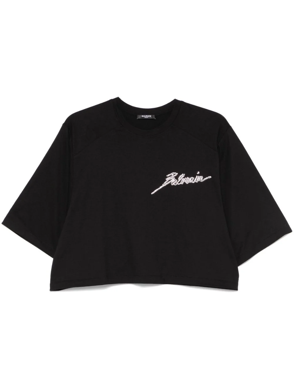 crystal-embellished T-shirt Highlights - Black - Crew neck - Short sleeves - Cropped Imported Composition Cotton 100%, glass 80%, Brass 20% SIZE & FIT Model measurements Height 5 ft 10 in(1.77 m) Bust/Chest 32.28 in(82 cm) Hips 35.03 in(89 cm) Waist 25.19 in(64 cm) FittingInformation Designed for an oversized fit, offering additional room throughout Cropped in length Made from a midweight non-stretch fabric, this piece offers minimal elasticity when worn