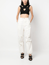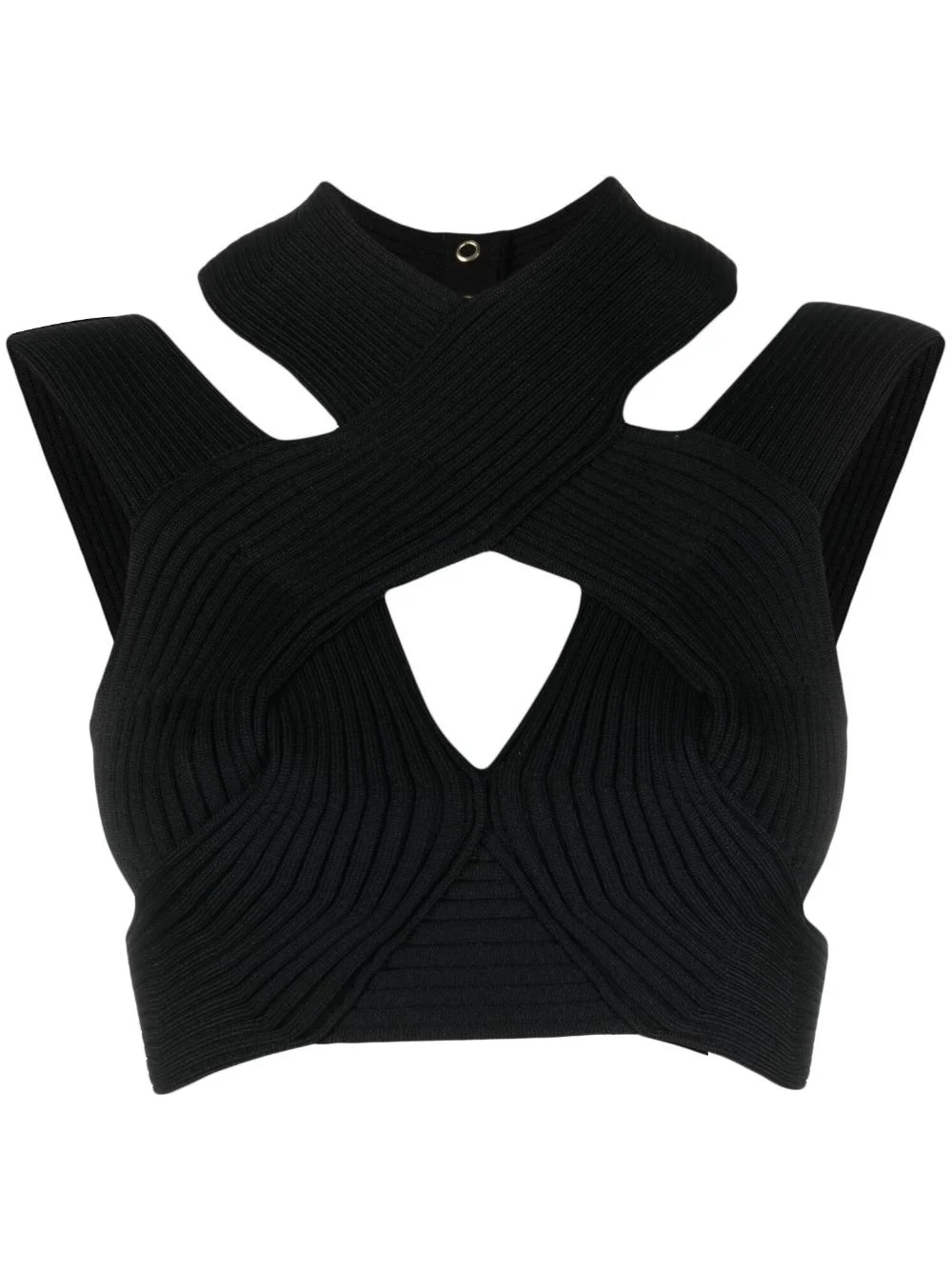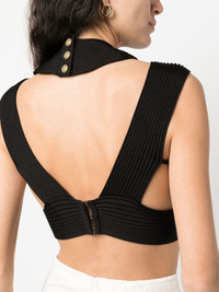 cut-out ribbed cropped top Balmain's signature ribbed jersey is used to craft this black sleeveless top, cut for a cropped length. Elevated with cut-out details at the chest, creating a crossover strappy design, this piece boasts a V-shaped back where it fastens with a hook and eye closure. Made in Italy Composition Viscose 83%, Polyamide 17% SIZE & FIT Model measurements Height 5 ft 10 in(1.79 m) Bust/Chest 33.07 in(84 cm) Hips 35.82 in(91 cm) Waist 24.01 in(61 cm) Washing instructions Dry Clean Only