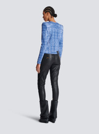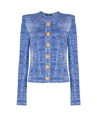 Jacquard knit cardigan with denim effect - Round neckline - Structured shoulders - Long sleeves - Fastening with 6 "Double Chain Lion" press studs in gold metal - Woven Balmain Couture label on the waist - Fitted cut - Model measures 179cm and wears a size 36 - Main material: 84% viscose 8% polyamide 8% polyester - Made in France - Item: EF1KL220KH80100% of the viscose fibres used to make this garment come from certified, sustainably managed forests