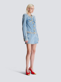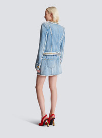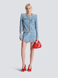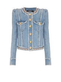 Denim jacket with pearl trim - Round neckline - Structured shoulders - Long sleeves - Straight buttoned cuffs - 2 flap patch pockets with decorative buttons - Front fastening with 6 buttons - "Gold Thread and Pearl" buttons in gold metal and pearl - Neckline and hem finished with gold metal chains and pearls - Raw hems - Straight cut - Model measures 176cm and wears a size 36 - Main material: 100% cotton - Made in Italy - Item: EF0SK81075DF