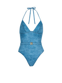 Denim one-piece swimsuit - V-shaped neckline - Ties at the neck - Low back with engraved "Balmain" gold metal label at the waist - Model measures 179cm and wears a size 36 - Main material: 85% polyamide 15% elastane - Made in Italy - Item: BKBL32520