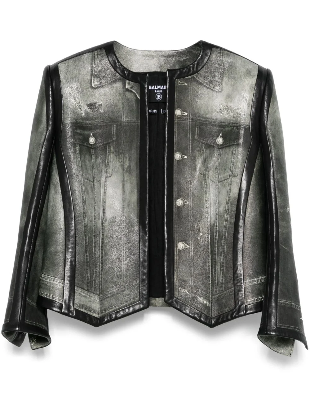 denim-print leather jacket Highlights - Grey/black - Open front - Round neck - Long sleeves - Full lining Imported Composition Goat Skin 100% SIZE & FIT Model measurements Height 5 ft 9 in(1.75 m) Bust/Chest 34.64 in(88 cm) Hips 36.61 in(93 cm) Waist 26.37 in(67 cm) FittingInformation Designed for a slim fit that sits just away from the body offering a close yet comfortable fit The narrow-cut sleeves offer a close fit at the arms Soft leather has a supple and smooth construction offering some flexibility