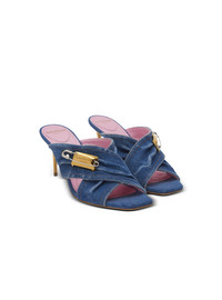 Denim Safety Pin mules - Open toe - Denim straps - Silver metal safety pin - Engraved Balmain Paris plaque in gold metal - Lacquered gold stiletto heel - Leather outsole - Contrasting leather insole embossed with a Diamond motif - Contrasting leather lining - Heel height: 7.5 cm - Main material: 100% cotton - Made in Italy - Item: EN1UR079TDMS
