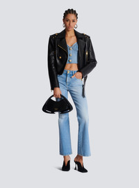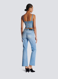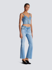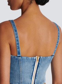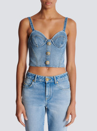 Denim top with thin straps - Cropped and fitted cut - Sweetheart neckline - 3 decorative two-tone "Double Chain Lion" buttons in gold and silver metal - Visible gold metal zip fastening on the back with Balmain-engraved slider - Light blue wash - Cotton lining - Model measures 179cm and wears a size 36 - Main material: 98% cotton 2% elastane - Made in Italy - Item: DF1AA345DE53